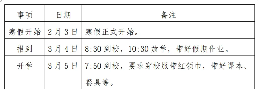 特别提醒:请您督促孩子按时返校,开学时,学生需携带假期作业、实践成果及必要的学习生活用品,班主任将组织开展收心教育及假期总结活动。