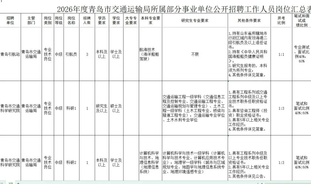 >2026青岛市交通运输局事业单位招聘开启,2.6日截止报名!本科及以上学历可报,笔面试成绩按4:6计算,竞争虽有但机会难得