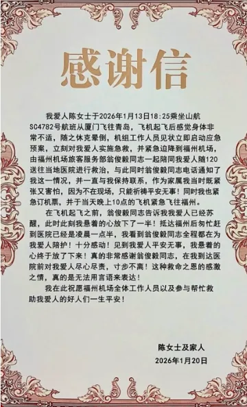 “这种感激之情,真的是无法用言语来表达!”家属在感谢信中写道,正是福州长乐国际机场机组人员的及时处置、医疗团队的专业救治,以及翁俊毅同志全程的尽心陪护,才让陈女士转危为安,也让远在异地的家属感受到了无尽温暖。