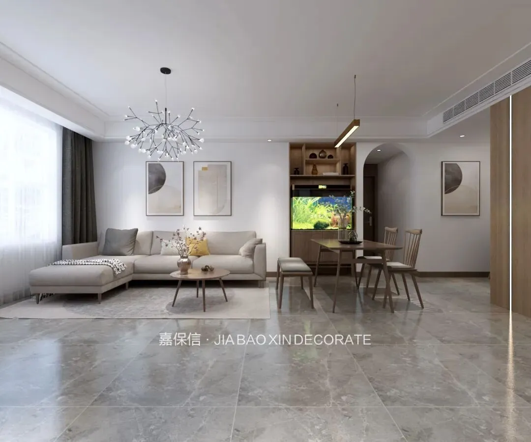 沙发墙仅以抽象装饰画点缀,悄然开启艺术与生活的对话。造型轻盈如树枝的吊灯,成为整个空间的视觉焦点。灰色大理石地砖映衬出北欧原木风的简约与精致,筒灯与吊灯交织出丰富的光影层次。时光在明暗流转中变得柔软,书写宁静而浪漫的日常。