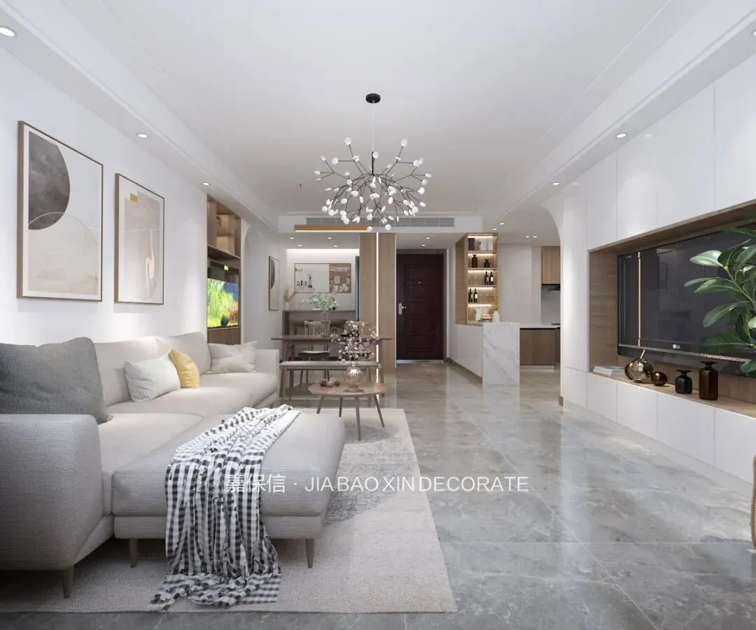 客餐厨一体的开放式布局,让空间通透而明亮,动线也分明。电视墙融合了木饰面与白色柜体,嵌入式设计巧妙兼顾了展示与收纳功能。浅灰色布艺沙发、木质茶几与灰色地毯的组合,围合出恬静舒适的休憩氛围。