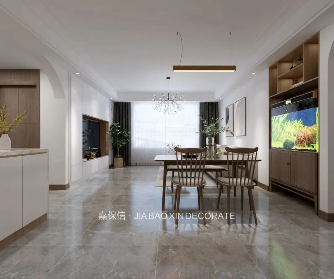 餐厅选用实木餐桌椅,造型简约而精致,布艺软垫提升了舒适感。靠墙一侧,利用墙体厚度,内嵌了一组实木储物柜,并与鱼缸融为一体,在满足收纳需求的同时,也为空间注入了自然的生机与活力。吊灯与筒灯相互配合,洒落温柔而均匀的光线,悄然点亮每一餐的好食光。