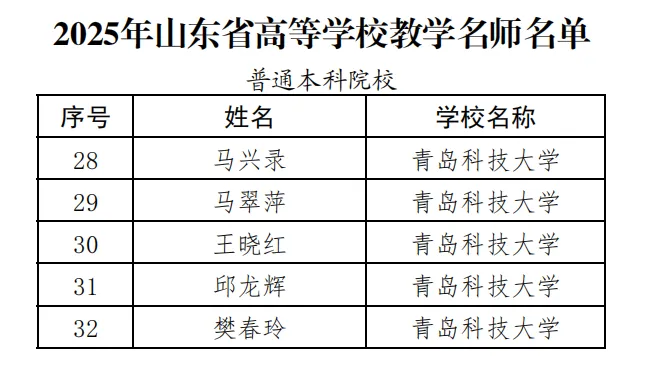此次5位教师获评省级教学名师,既是对其个人教学实绩的充分肯定,更是青岛科技大学深化教育教学改革、坚持“以本为本”育人实践的集中体现。青岛科技大学将以此次获评为契机,进一步弘扬尊师重教之风,持续强化教学名师的示范引领作用,通过建强基层教学组织、深化传帮带、拓展辐射面等系列举措,将其先进育人理念与成功经验转化为推动全校教师队伍发展的强劲动力,引导广大教师争做“四有”好老师,为培养担当民族复兴大任的时代新人奠定坚实师资基础。