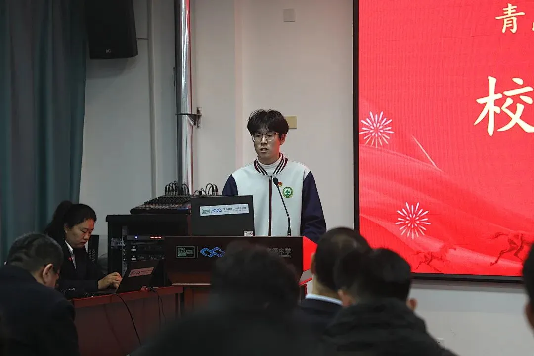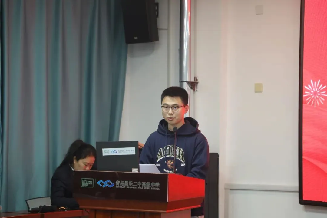 在校生代表唐骋宇登台发言,首先感念学长学姐返校带来的温暖,更满怀传承的感动;其次分享自身成长感悟,见证校园日新月异,也实现自我内化于心的成长;最后作出在校生承诺:学长学姐是照亮我们前路的灯塔,你们在广阔天地奋发有为、捷报频传,更让我们坚信,走得再远,根永在此,成就再高,情永系于此。我们即将迎战高考,必将以学长学姐为楷模、以恩师为指引、以母校为荣光,珍惜当下、笃行不息,续写青岛昌乐二中高级中学新篇章。