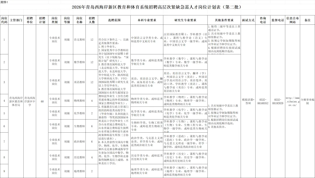 根据《事业单位人事管理条例》(国务院令第652号)、《事业单位公开招聘人员暂行规定》(人事部令第6号)等文件要求以及省、市有关规定,2026年青岛西海岸新区教育和体育系统招聘高层次紧缺急需人才60人(第二批),现将有关事项公告如下:2.国家优秀中小学教师培养计划2026年应届硕士研究生(以下统称为:“国优计划”研究生)。3.教育部直属师范大学(北京师范大学、华东师范大学、东北师范大学、华中师范大学、陕西师范大学和西南大学,下同)2026届优秀硕士研究生及以上学历毕业生。4.教育部直属师范大学2026届山东省生源国家公费师范毕业生(含符合跨省就业规定的外省2026届国家公费师范毕业生)。5.省级教育行政主管部门组织的师范类高校学生(毕业年级)从业技能大赛获得一等奖的2026届本科及以上学历毕业生(不含山东省属公费师范生,山东省属公费师范生按照山东省属公费师范生就业政策和师范生所签三方协议进行就业)。6.本人曾获得全国高中数学、物理、化学、生物学科奥林匹克竞赛金牌或指导学生参加全国高中数学、物理、化学、生物学科竞赛取得铜牌及以上成绩,本科及以上学历。(一)应聘人员应具备招聘岗位所规定的资格条件(见附件1),并符合下列条件:3.热爱教育事业,具有良好的政治素质、敬业精神、师德修养和学习成绩,品行端正;5.年龄在38周岁以下(1987年1月以后出生),招聘范围1、6的应聘人员年龄可放宽到43周岁以下(1982年1月以后出生);1.定向、委培毕业生报考,须征得定向、委培单位同意。2.现役军人、在读的非应届毕业生、青岛西海岸新区教育和体育系统事业编制及控制总量备案管理教职工不得应聘。3.因犯罪受过刑事处罚的人员,被开除中国共产党党籍的人员,被开除公职的人员,被依法列为失信联合惩戒对象的人员,被记入事业单位公开招聘诚信档案库且记录期限未满的人员,列入《青岛市教职员工准入查询性侵等违法犯罪信息制度实施细则》范围的人员,以及有法律法规规定不得聘用为事业单位工作人员的其他情形的人员不得应聘。4.应聘人员不得报考有《事业单位人事管理回避规定》(人社部规〔2019〕1号)中应回避情形的岗位。本次招聘采取网上邮箱报名方式进行。符合条件的应聘人员,根据应聘岗位,如实完整分类填写《2026年青岛西海岸新区教育和体育系统招聘高层次紧缺急需人才报名登记表(第二批)》(附件2)、《2026年青岛西海岸新区教育和体育系统招聘高层次紧缺急需人才报名信息一览表(第二批)》(附件3,Excel电子版),连同报考岗位所需相关证书材料的电子版(照片或扫描件等)在规定的时间内打包发送至报名邮箱(xqjtjrsk@126.com),邮件主题命名为“岗位代码+岗位名称+姓名”(不按规定注明岗位、姓名等信息的不予受理),每人限报一个岗位。邮件发送后须及时在工作时间段拨打相关报名咨询电话(0532—86160352)进行确认。未进行电话确认而影响报名的,责任自负。报名时间为2026年1月30日至2026年2月9日。1.《2026年青岛西海岸新区教育和体育系统招聘高层次紧缺急需人才报名登记表(第二批)》原件以及与本表电子版同底版的2寸近期免冠彩色照片两张(照片背面注明:报考岗位+姓名)。3.二代身份证原件及复印件(复印件使用A4型纸复印清晰,下同)。4.毕业证书、学位证书及相应教师资格证书原件及复印件。6.定向、委培毕业生还需提交定向、委培单位同意应聘的证明。已签约其他单位的,需提交有用人权限的单位和主管部门出具的同意应聘证明,对出具同意应聘证明确有困难的在职人员,经招聘单位同意,可在考察时提供,考察时不能提供同意应聘证明的,取消聘用资格。7.符合招聘岗位条件要求的获奖证书(省级教育行政主管部门组织的师范类高校学生从业技能大赛一等奖)原件和复印件。根据报名审核情况确定进入面试范围人选。未按规定提供材料的,视为个人自动放弃。应聘人员如有隐瞒情况、提供虚假材料或不符合招聘条件的,一经查实,取消应聘资格。对应聘人员的资格审查工作,贯穿于招聘工作的全过程。面试具体时间及要求通过青岛西海岸新区政务网公开发布,请考生及时关注。同一招聘岗位进入面试范围人数超过30人且无法在一天内完成面试的,可增加初试环节,根据初试成绩,按招聘岗位由高分到低分确定进入面试人员。初试当天,如实际到场参加初试的人数不超过30人,不组织初试,实际到场参加初试人员全部进入面试,未到场参加初试人员取消面试资格。初试成绩不计入总成绩。增加初试的,初试方式由青岛西海岸新区教育和体育局根据实际情况确定,初试相关信息将提前告知考生。面试工作在事业单位公开招聘主管部门监督指导下,由招聘主管部门按照事业单位公开招聘有关要求组织实施。根据招聘岗位的需求和特点,面试采取“模拟讲课+答辩”的方式进行,主要考核岗位所需的基本能力和专业水平。面试成绩采用百分制,并计算到小数点后两位数,尾数四舍五入。面试各环节分别由考官打分,去掉一个最高分和一个最低分后计算平均成绩。模拟讲课、答辩两项满分均为100分,两项成绩分别按70%、30%的比例计算面试成绩。面试成绩在每个岗位或每场面试结束后,当场向应聘人员宣布,并于面试当天通过青岛西海岸新区政务网公布。↓岗位表(点开查看大图)↓