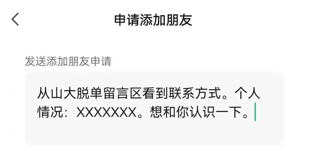 4.在添加对方为好友时,请注明联系方式来自山大脱单留言区,并附上基本个人信息。