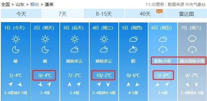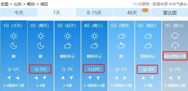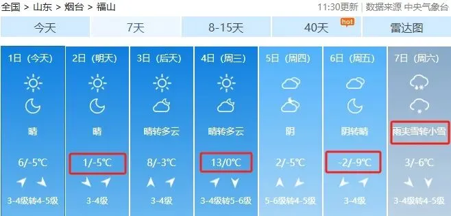 烟台市区:2月1日白天,晴到少云,西南风转西北风3~4级,最低气温-6℃,最高气温5℃。