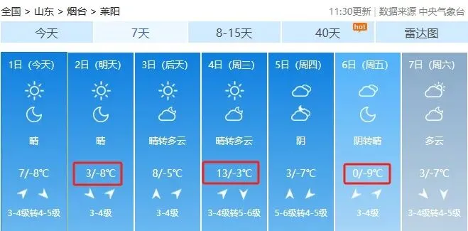 烟台各县市:2月1日白天,晴到少云,西南风转西北风,沿海及内陆3~4级,最低气温,沿海-6℃,内陆-8℃。最高气温,沿海5℃,内陆6℃。
