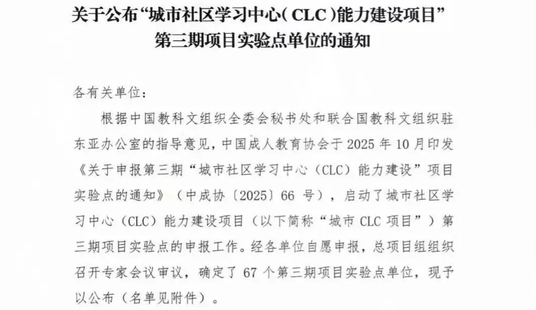 城市CLC项目是由联合国教科文组织指导、中国成人教育协会牵头实施的国际合作项目,旨在通过实验点建设践行终身学习理念,打造社区教育创新样板,助力学习型社会建设。自启动以来,该项目已形成一批可复制推广的经验成果,此次全国仅67家单位入选第三期实验点,山东省入选2家。