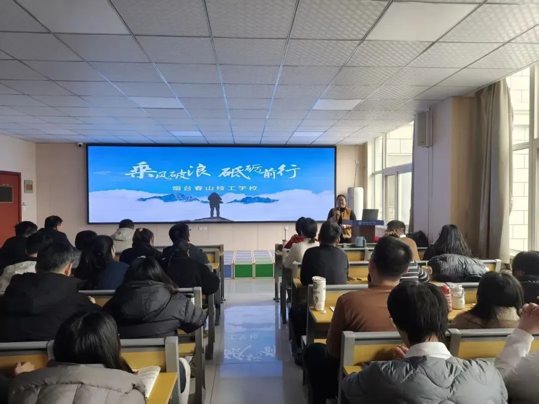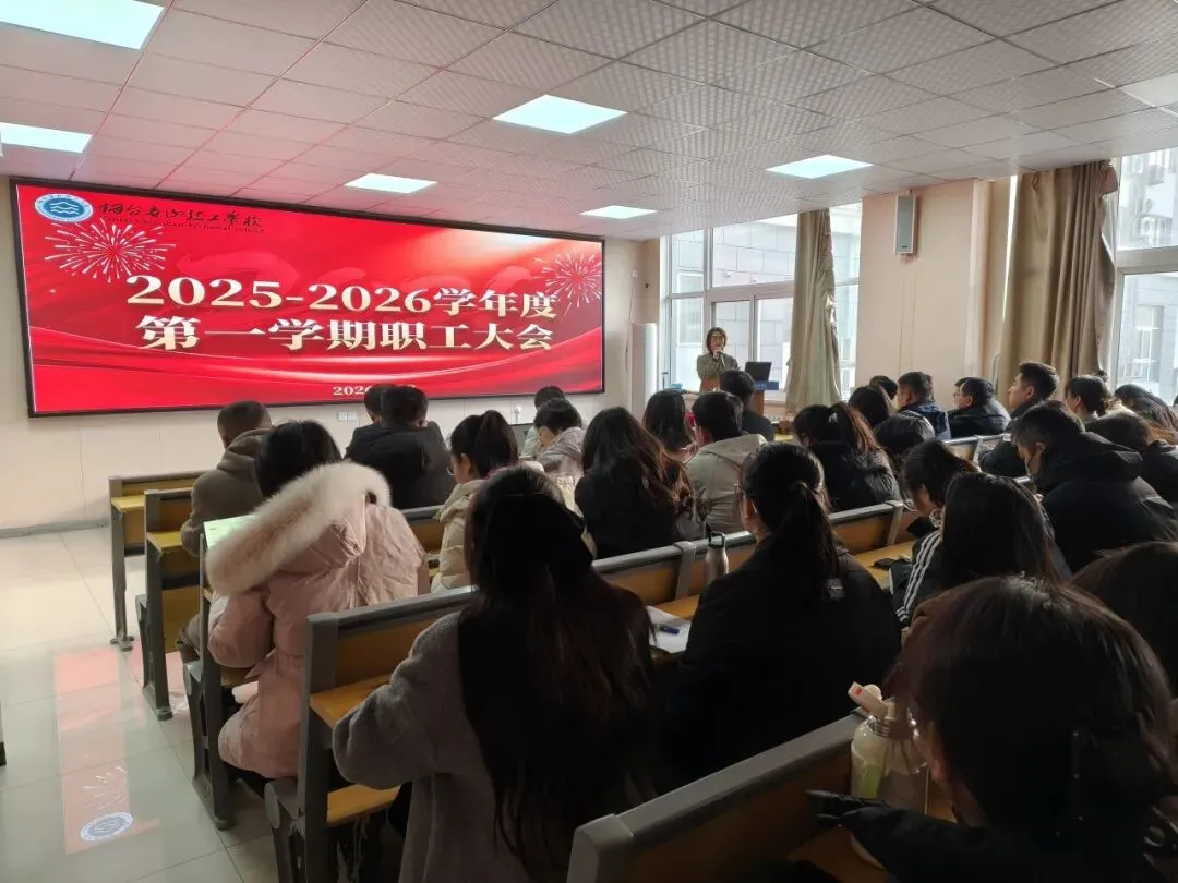 2026年1月28日,烟台春山技工学校召开2025-2026学年度第一学期全体职工大会。会议旨在总结学期工作,表彰先进典型,部署重点任务,凝聚发展共识。大会由学校办公室主任齐巧梅主持。