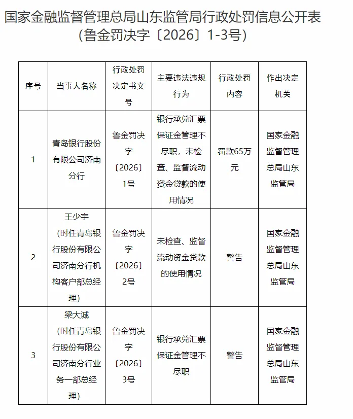 近日,国家金融监督管理总局山东监管局公布了针对青岛银行股份有限公司济南分行及其相关责任人的行政处罚信息(鲁金罚决字〔2026〕1 - 3号),此次处罚剑指该行在业务操作过程中的违规行为。