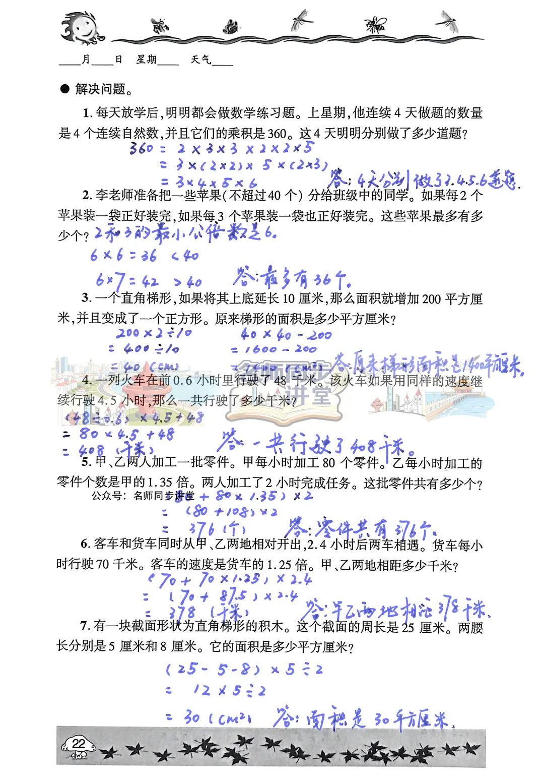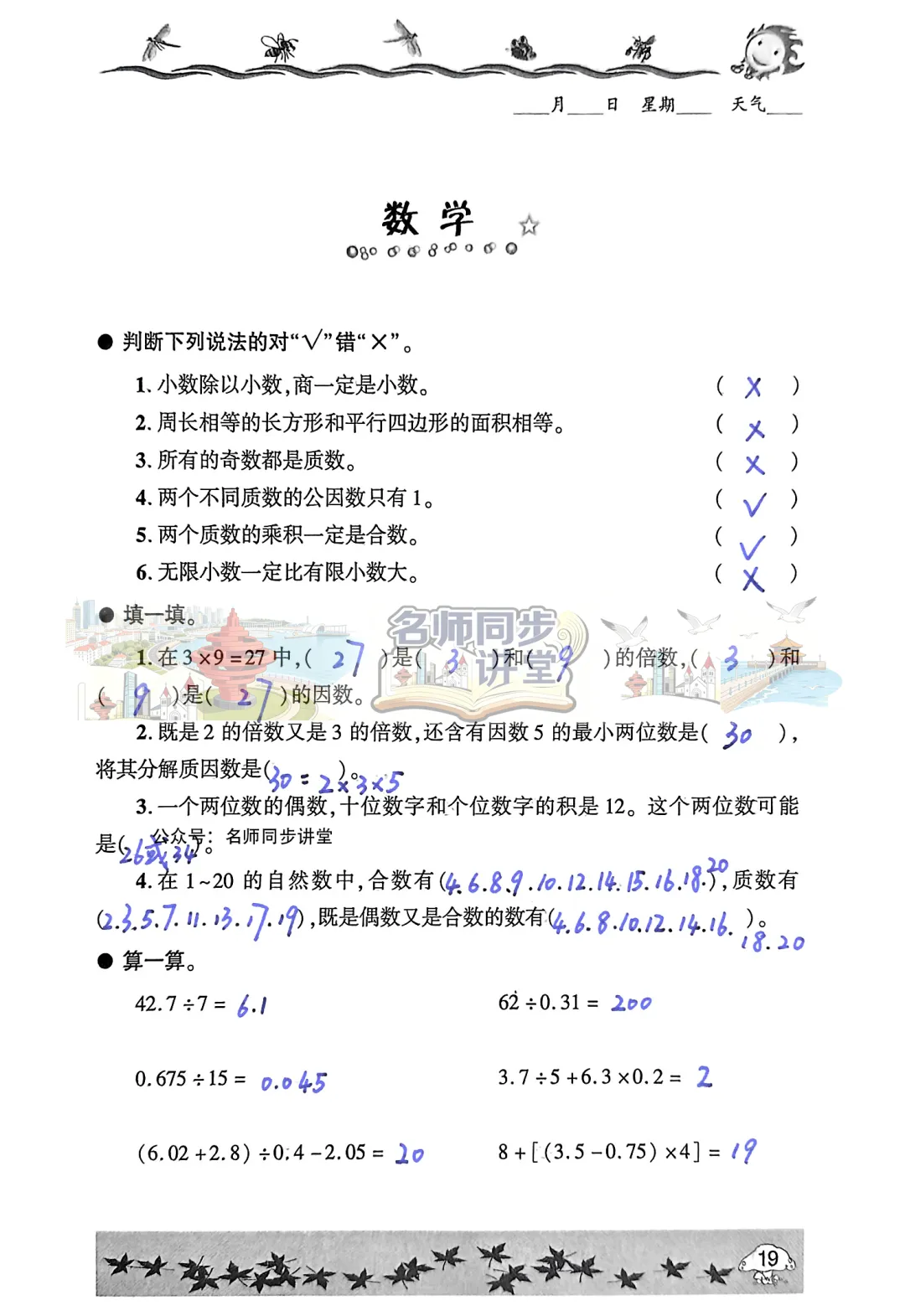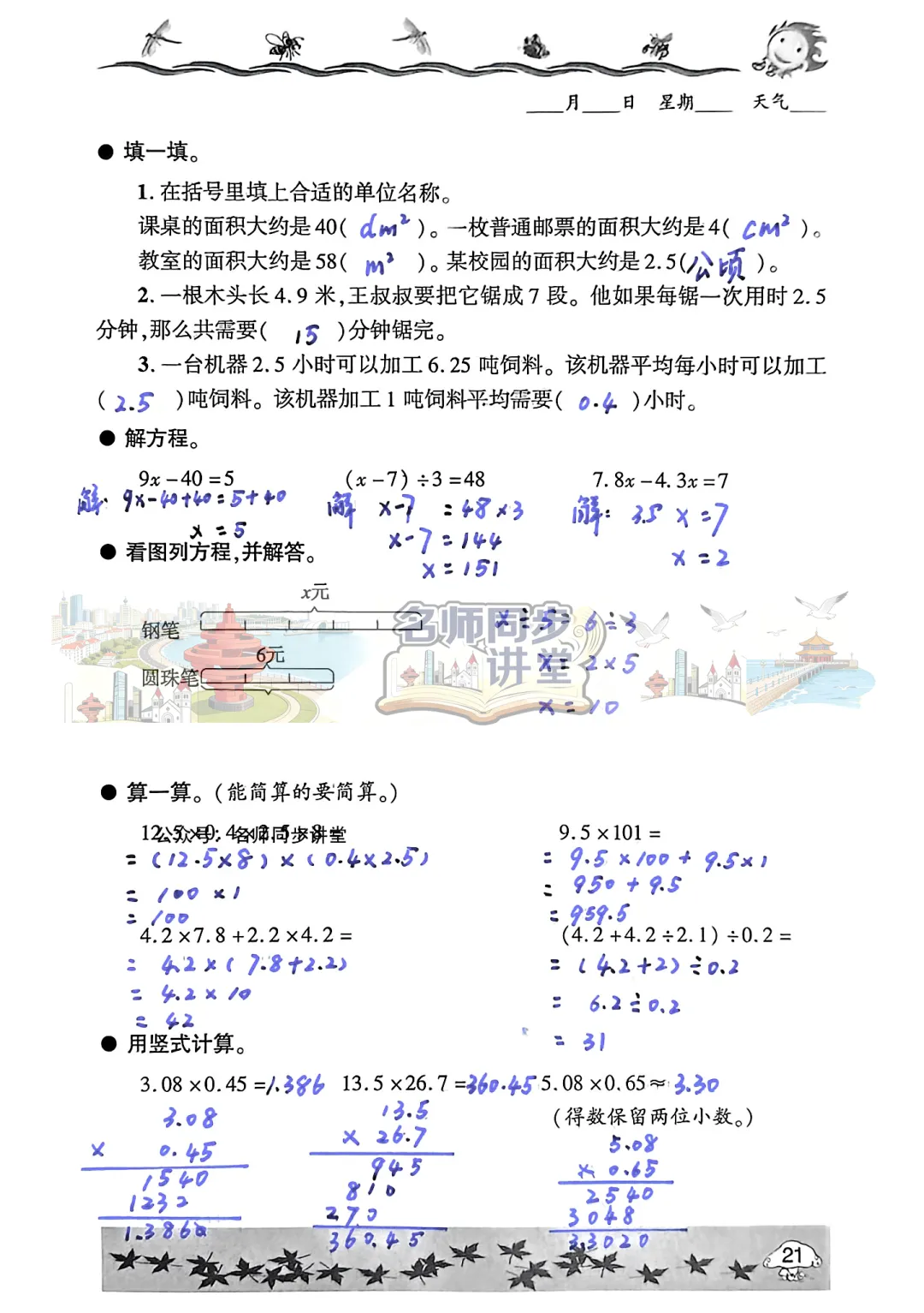 >2026新版寒假生活指导答案(六三制青岛出版社)五年级-第二部分-数学