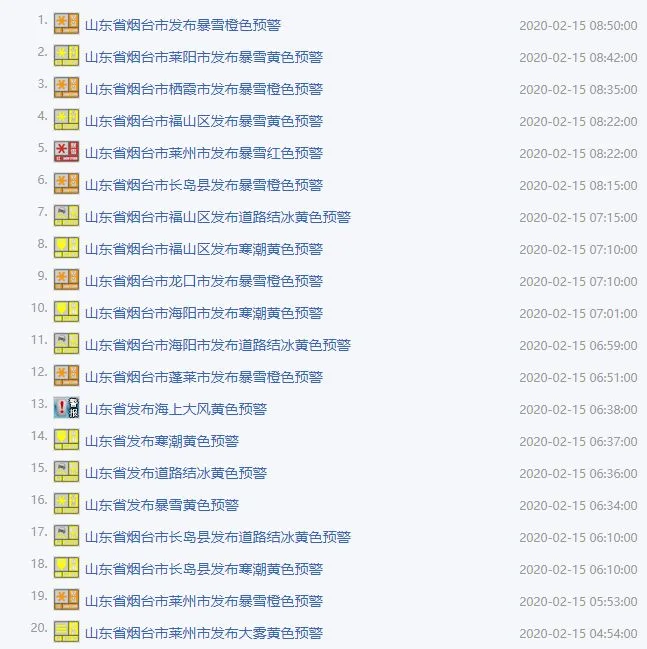 烟台市气象台2月15日8时50分发布暴雪橙色预警信号:目前,我市西部地区6小时内降雪量已达10毫米以上,预计今天白天西部地区仍有小雪,其他地区有中雪局部大雪。为此,烟台市气象台15日8时50分将暴雪黄色预警信号升级为暴雪橙色预警信号,请注意防范。(预警信息来源:国家预警信息发布中心)