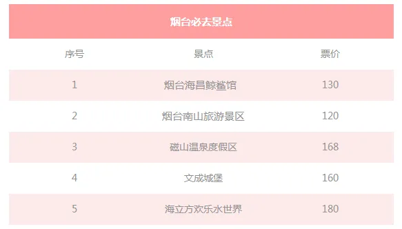 烟台海昌鲸鲨海洋公园、龙口南山大佛、烟台磁山温泉、北极星钟表博物馆、勃朗滑雪场、世乐家儿童主题乐园、农博园、蓬莱文城城堡、南山公园动物园、农禅谷、清谷农场、丛麻院、太虚宫、地质文化奇石馆、旭耕农场、牟氏庄园、海立方水世界。