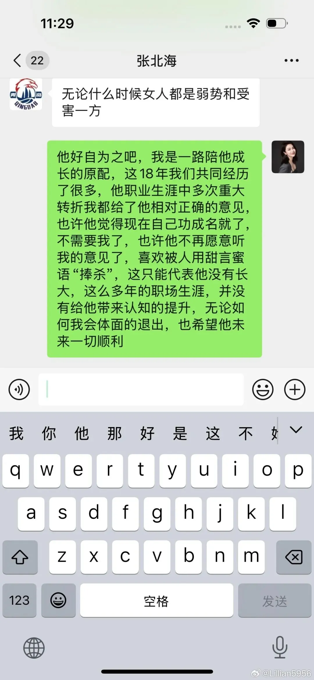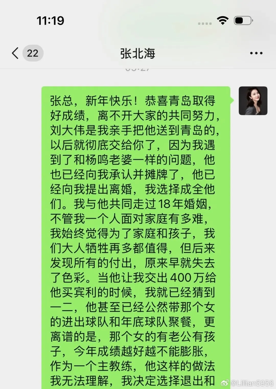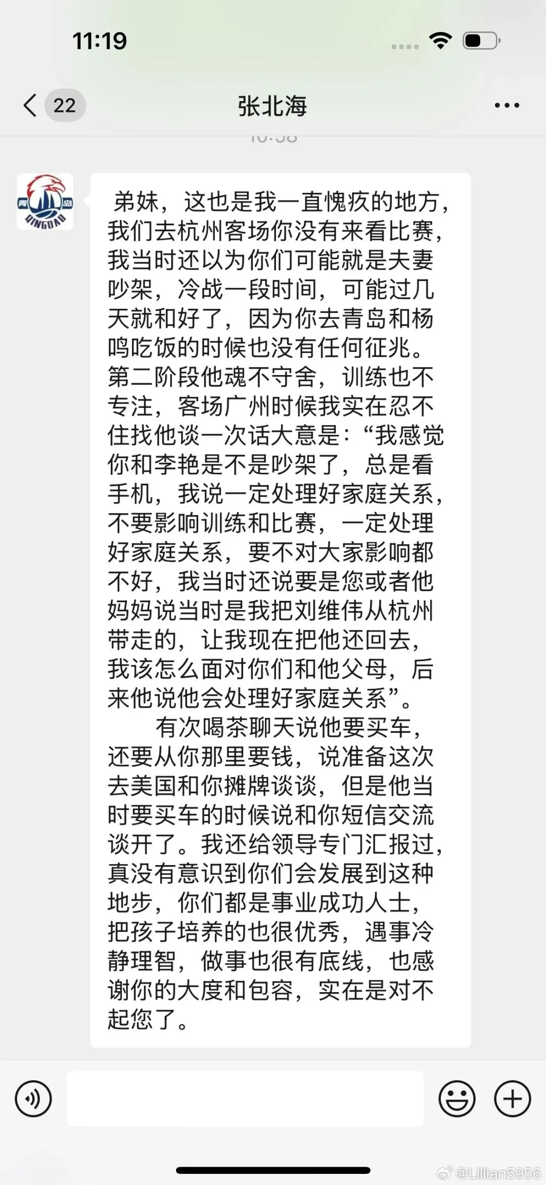 张北海写道:“弟妹,这也是我一直愧疚的地方,第二阶段他魂不守舍,训练也不专注,客场广州时候我是在忍不住找他谈一次话,后面捡他说他会处理好家庭关系。”“他天天看手机,我知道肯定有情况了,最初我真以为是和你聊天。后来的事情你都知道了,我不太认同他这样做,虽然他说会把房子财产都留给你和孩子,但是我还是觉得问题是出在他身上:有他后悔的时候。”张北海回复。