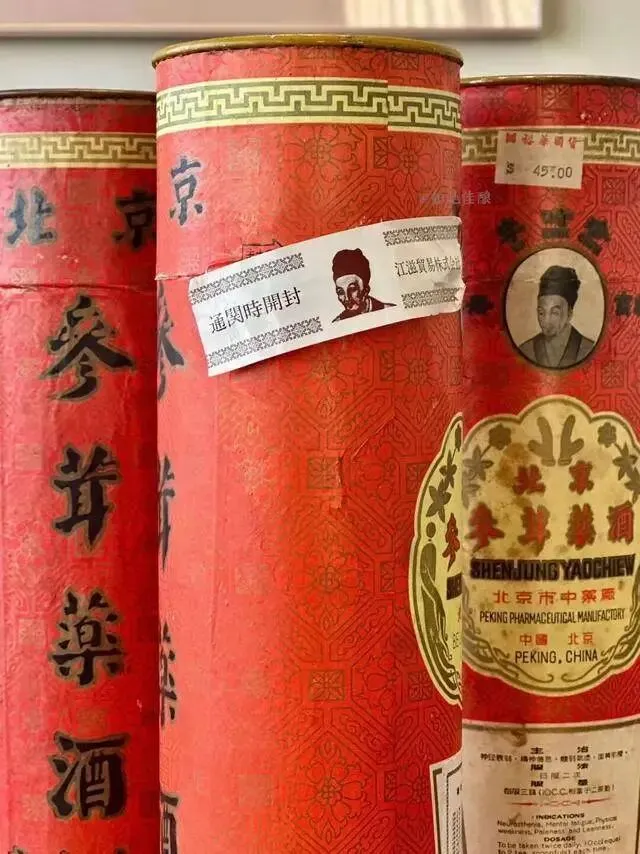 这款出口的参茸药酒采用出口“李时珍牌”专用商标,647毫升装,外面是圆形硬纸筒,包装考究。“炮制虽繁必不敢省人工,品味虽贵必不敢减物力。”