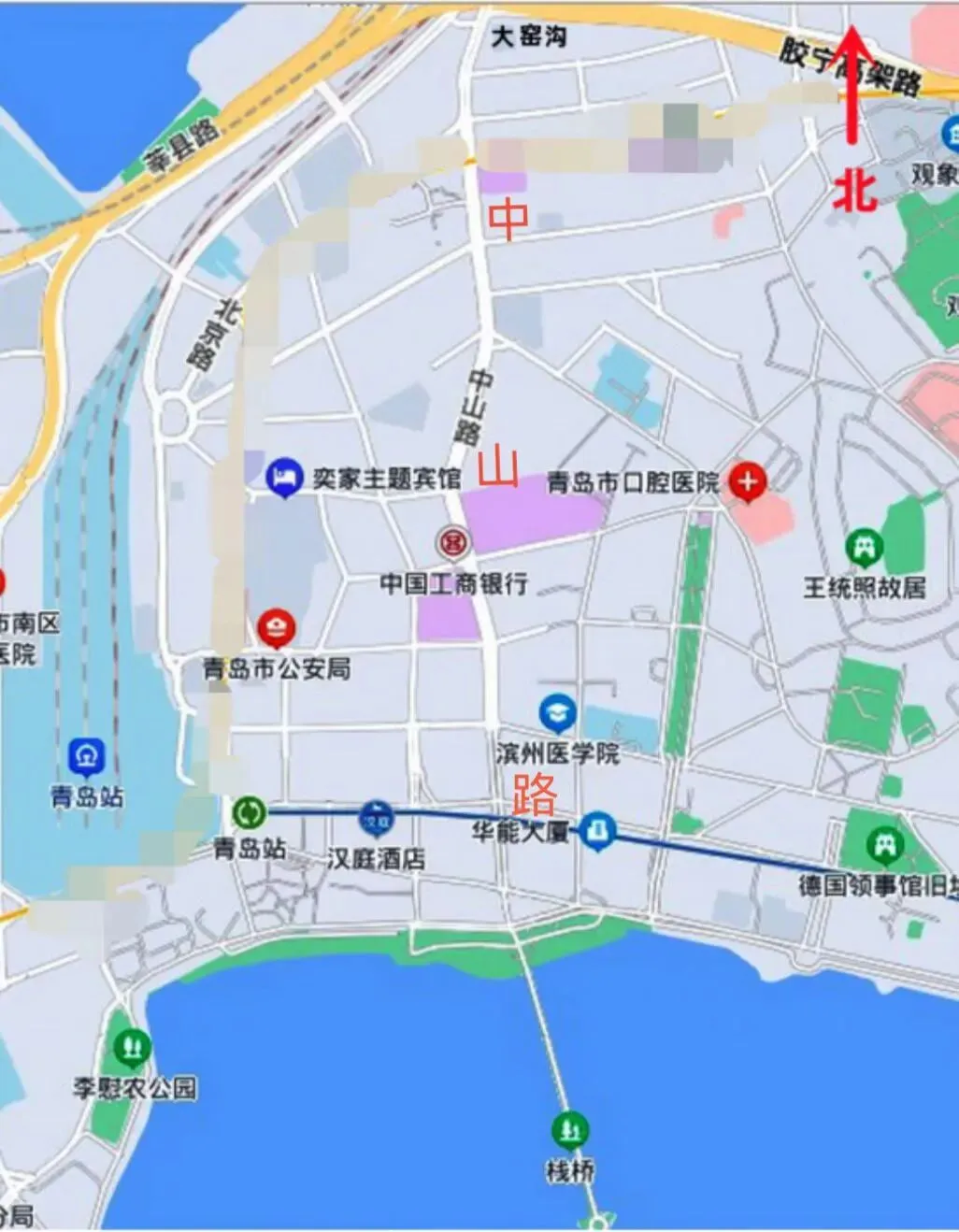 中山路,南接青岛著名的风景名胜“栈桥”,北抵青岛的老遗址“大窑沟”(市场三路、堂邑路、济南路交口),全长约3华里。
