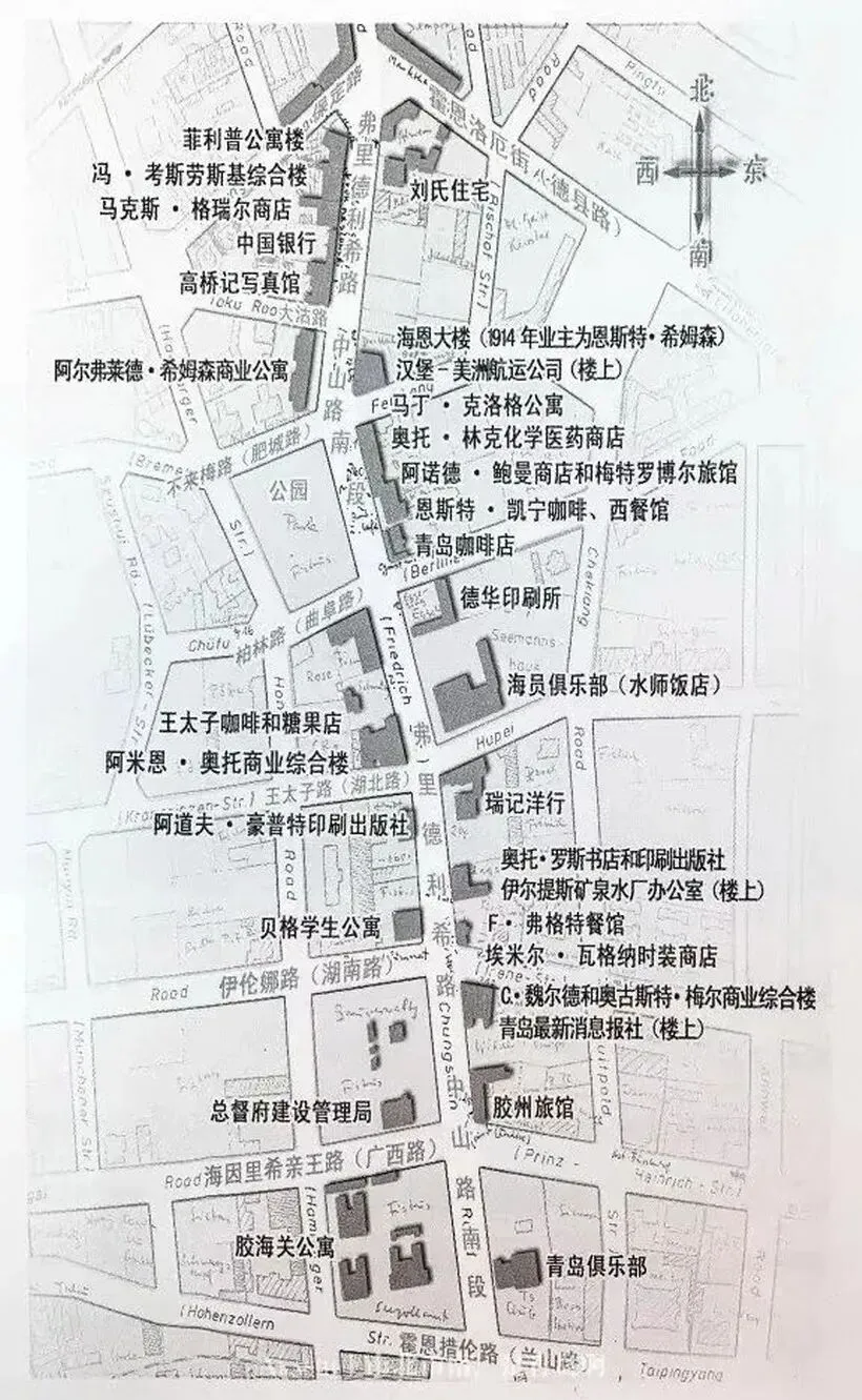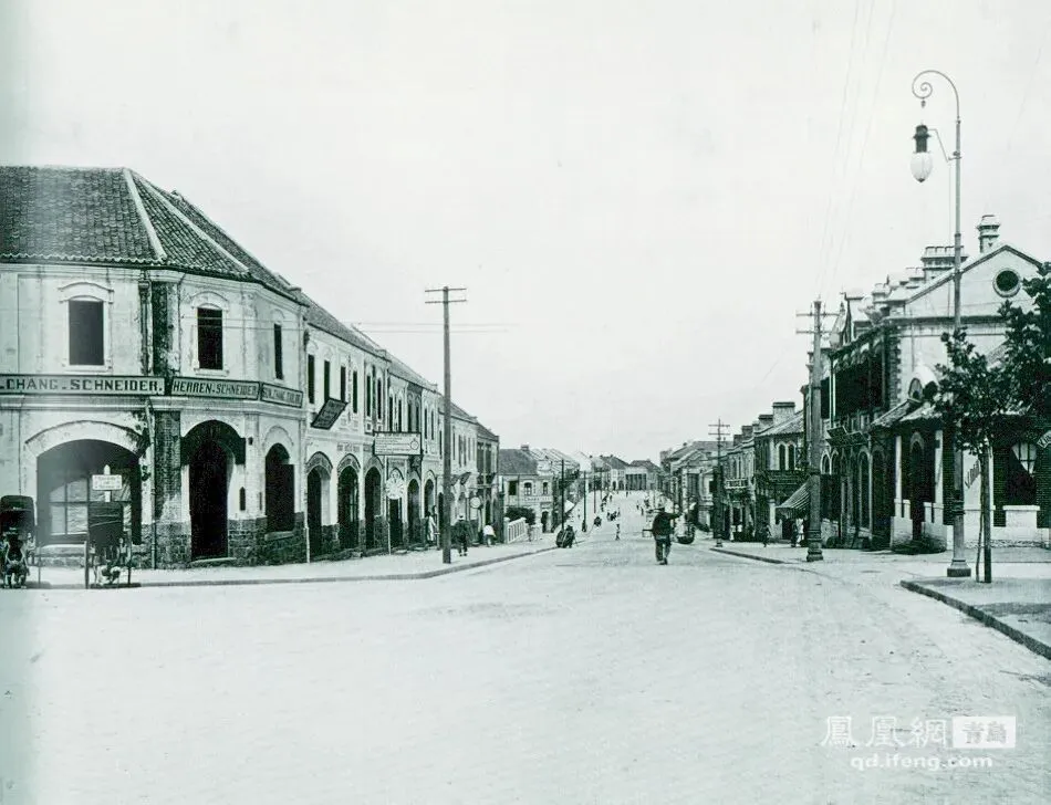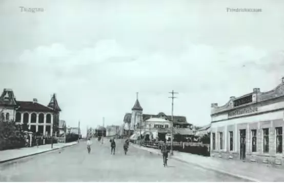 德占青岛时期,中山路被称为财富和娱乐大道。1910年出版的一本名为《青岛及其近郊指南》的旅行笔记里,记录了F·贝麦和M·克里格这两个德国人的行走印象,这本书后来成了欧洲人探访这个新兴港口城市的指南:从栈桥开始沿着斐迭里街(中山路)北行,在右侧先后经过霍恩佐勒路(兰山路)、亨利王子路(广西路)、伊伦娜路(湖南路)。伊伦娜路西面的第二幢房子是胶州图书馆。在亨利王子路和伊伦娜路之间,左侧是建筑经理的住宅楼,右侧是胶州旅馆和柏伦的住房,《青岛最新消息》的编辑部也设在这里。再向北行,左侧是贝格学生公寓大楼,用于安置总督府学校的外地学生,右侧是瓦格纳的时装商场和阿豪德卡贝克洋行。越过太子路(湖北路)后,首先就是水师饭店俱乐部,这是警卫部队和巡洋舰队的下级军官和军士们休息娱乐的场所,是1898年奉普鲁士王子亨利殿下之命而建的,当时他任巡洋舰队司令,抵达青岛后命令要满足驻地德国士兵的休闲和娱乐……