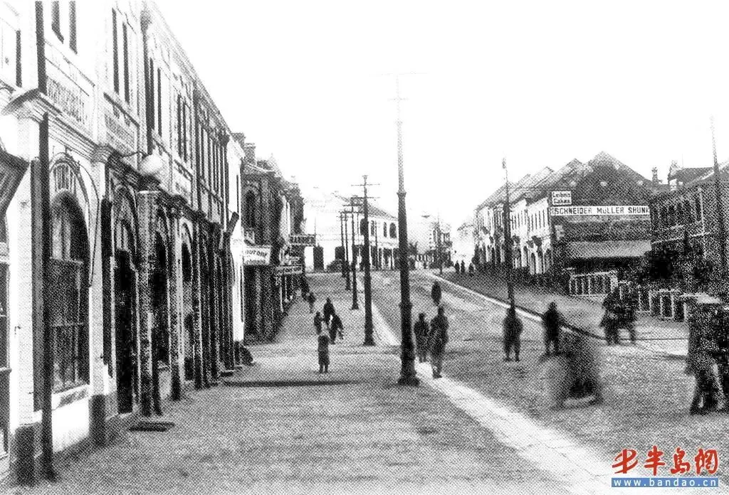 图中右侧的那排平房是瓦格纳时装商场(该建筑已拆除),紧邻它西边的那栋建筑是阿豪德卡贝克洋行(也有资料称奥古斯特·迈尔商业综合楼)。(网络照片)