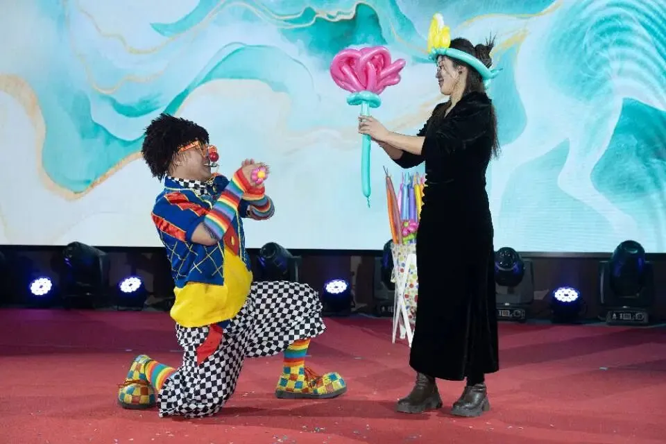 ;单人歌手献唱经典曲目,旋律悠扬婉转;变脸节目惊艳亮相,演员手法娴熟、身法灵动,一张张脸谱在瞬间切换,红、黑、蓝、白各色脸谱轮番登场,搭配铿锵的锣鼓声,将传统艺术的独特魅力展现得淋漓尽致,引得现场观众阵阵惊叹与喝彩;小丑表演诙谐逗趣,与现场观众互动频频,轮番将氛围推向高潮。