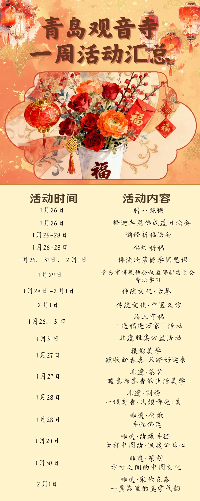 2026年1月28-2月1日,青岛观音寺5个班次的古琴公益课开课。