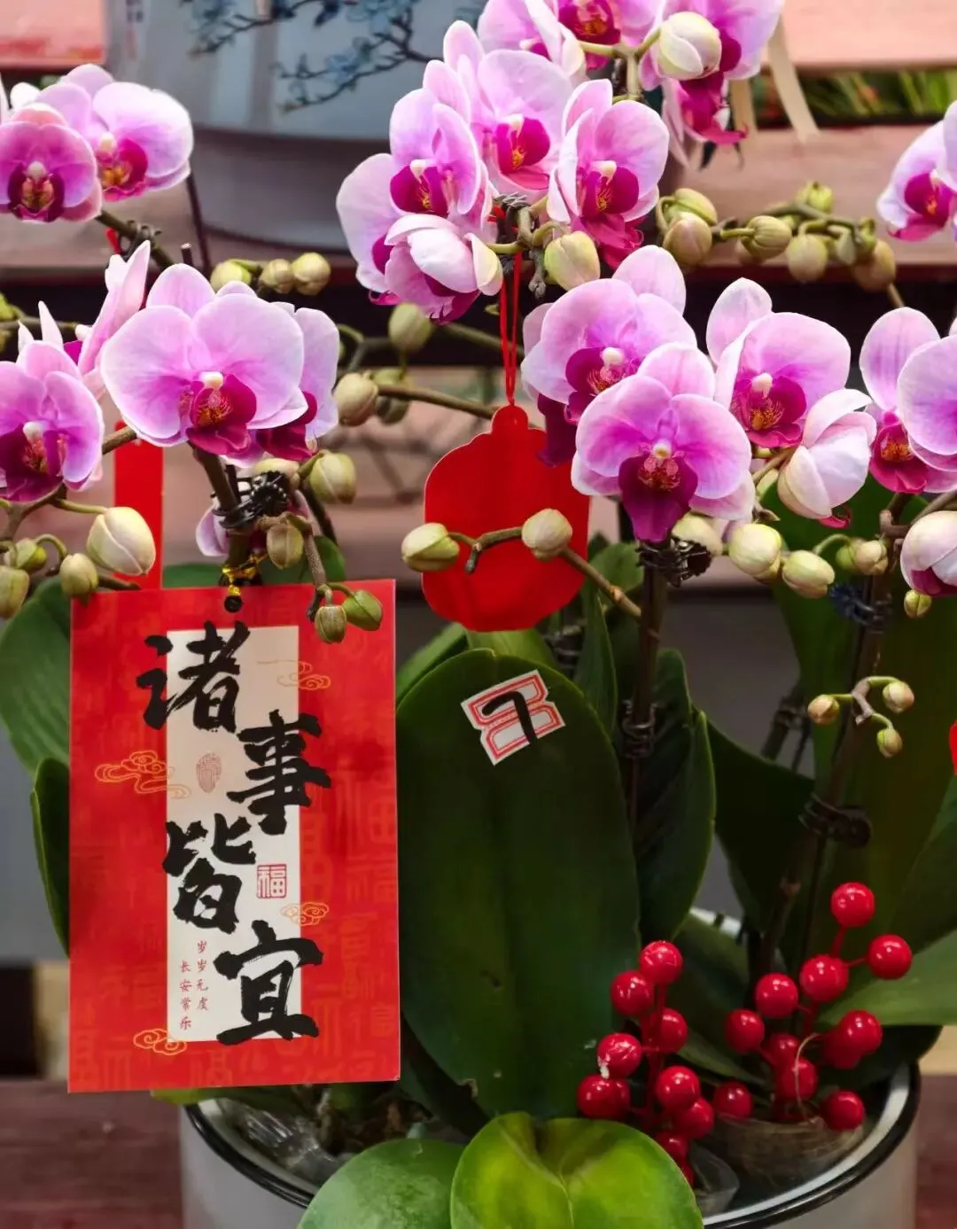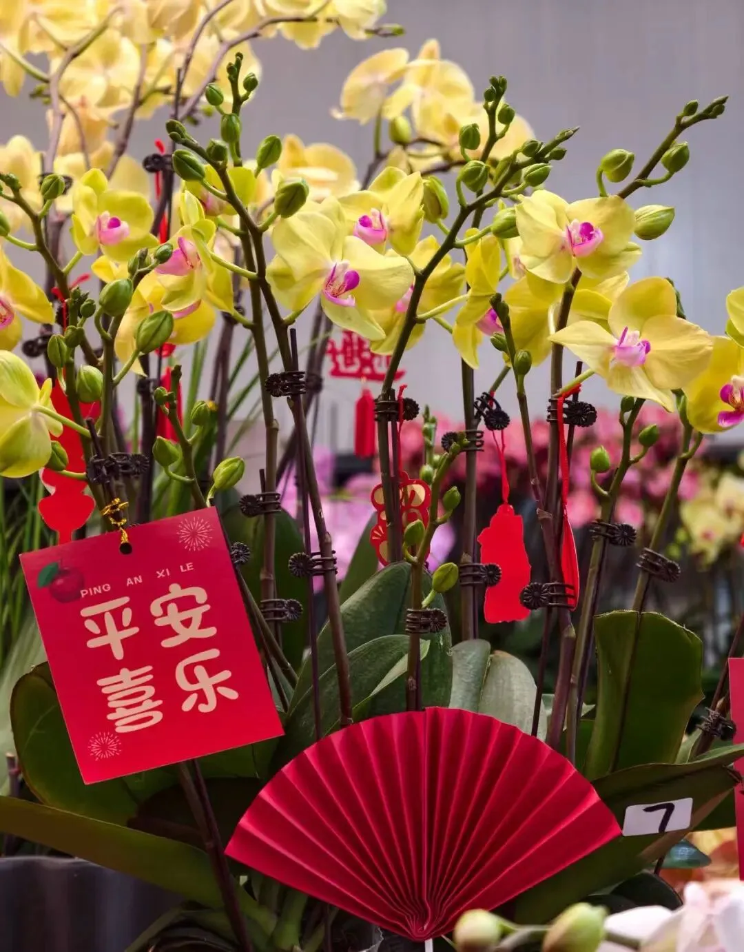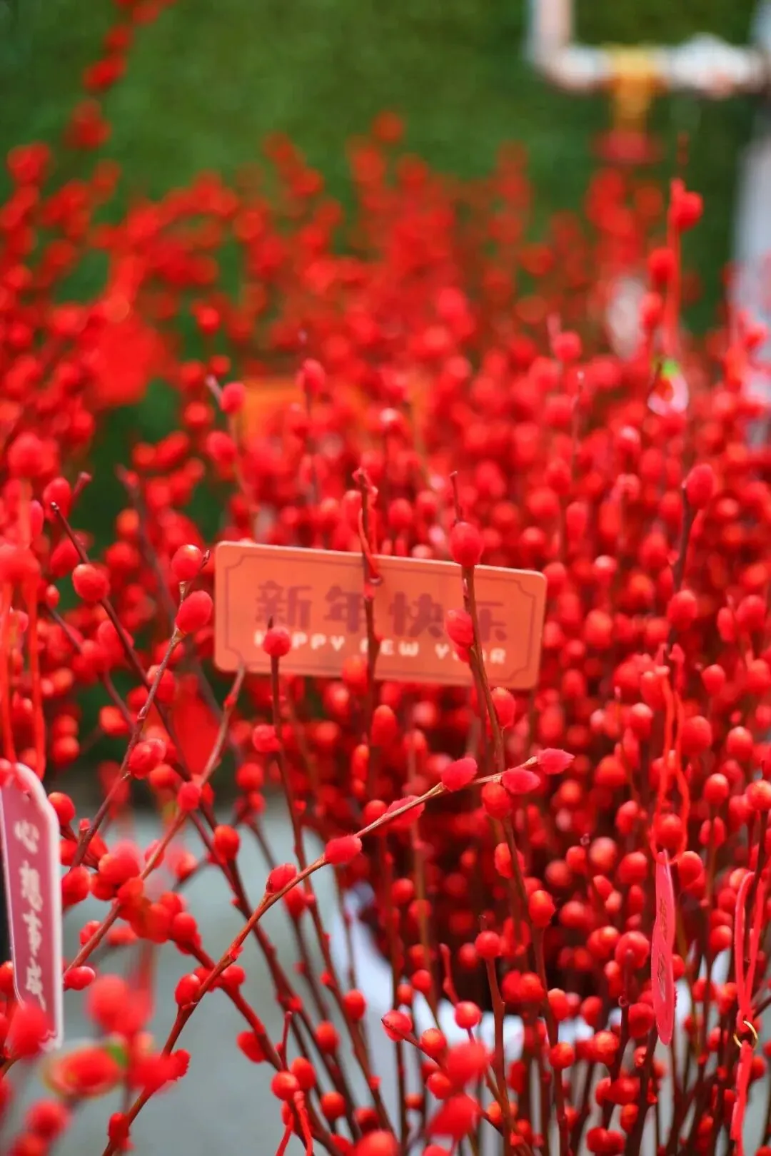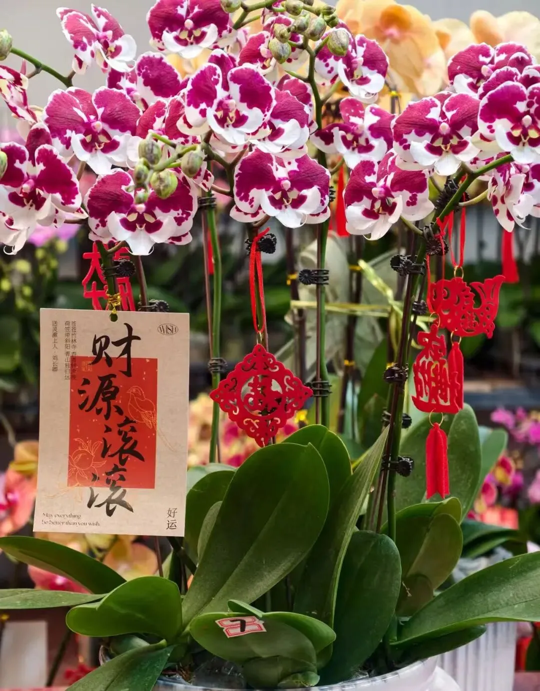 许多花卉上还贴着小小的祝福语——财源滚滚、诸事皆宜、平安喜乐......