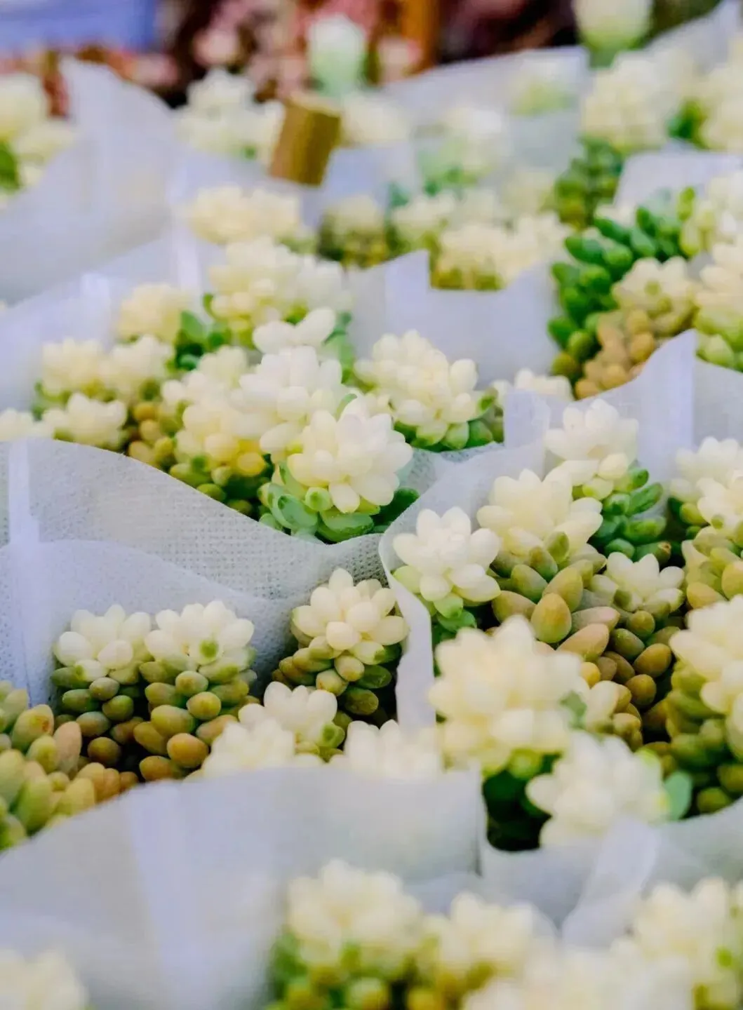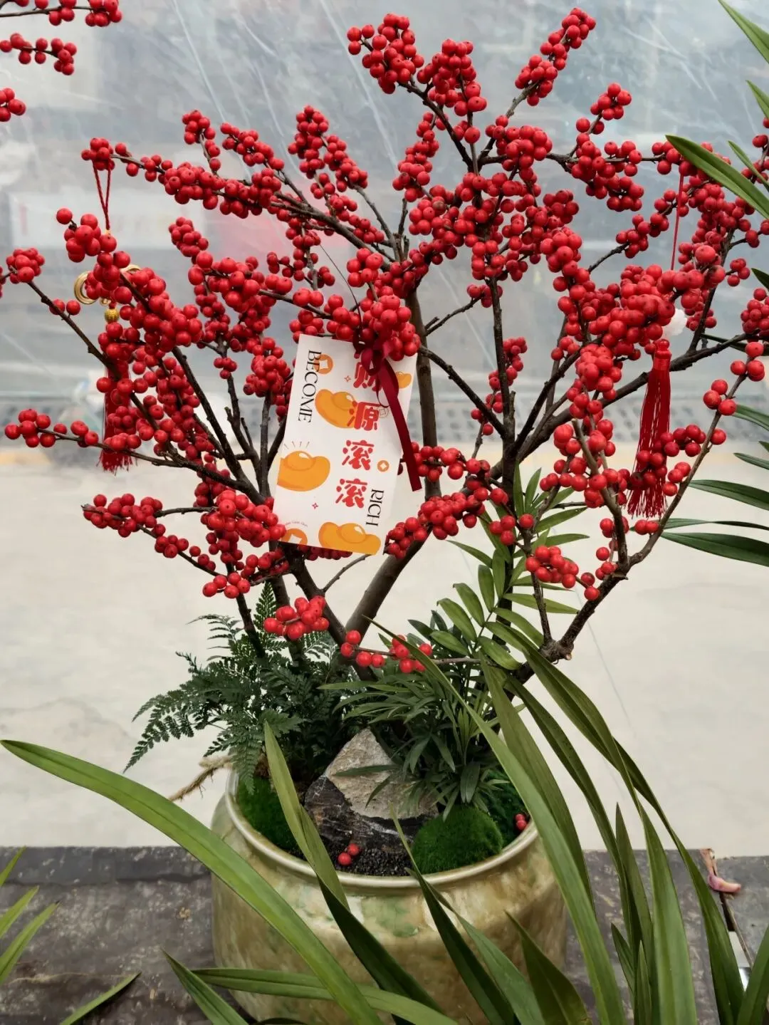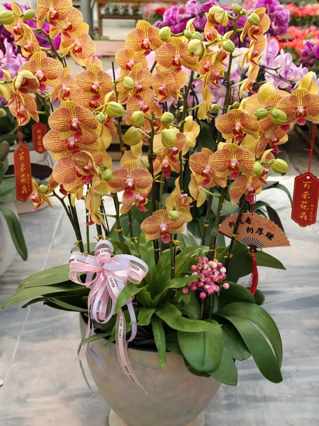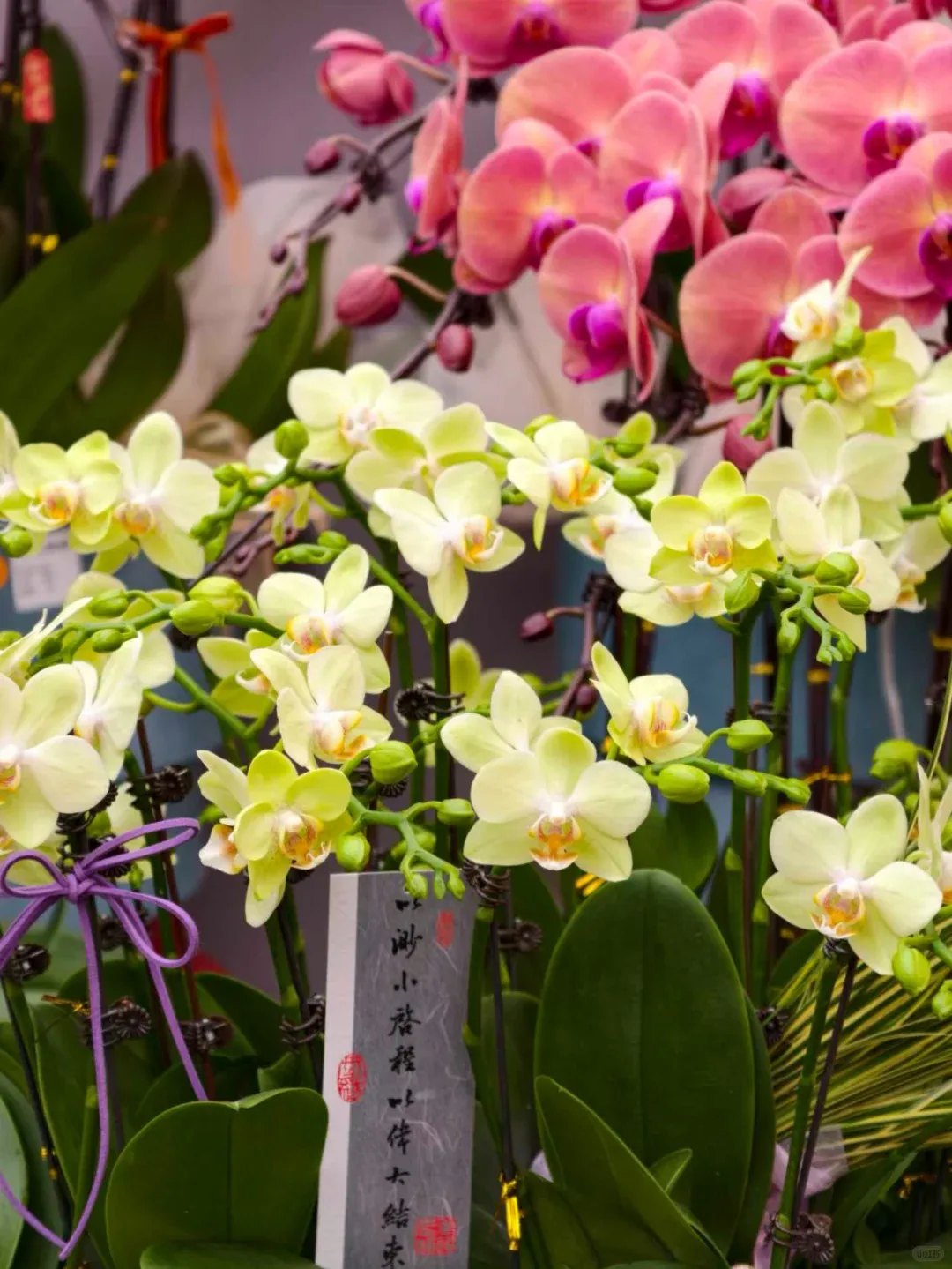 许多花卉上还贴着小小的祝福语——财源滚滚、诸事皆宜、平安喜乐......