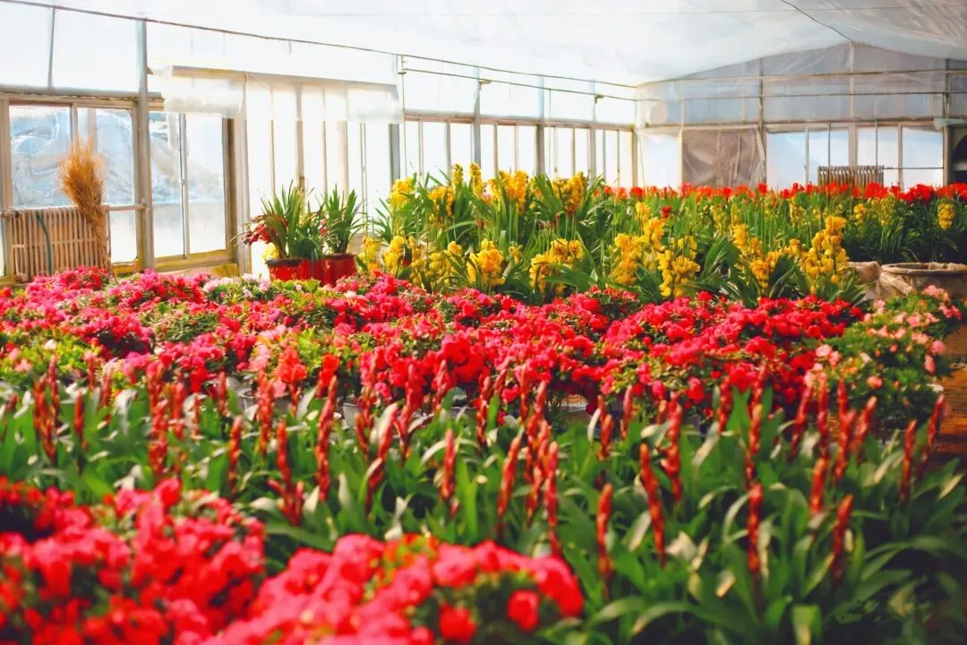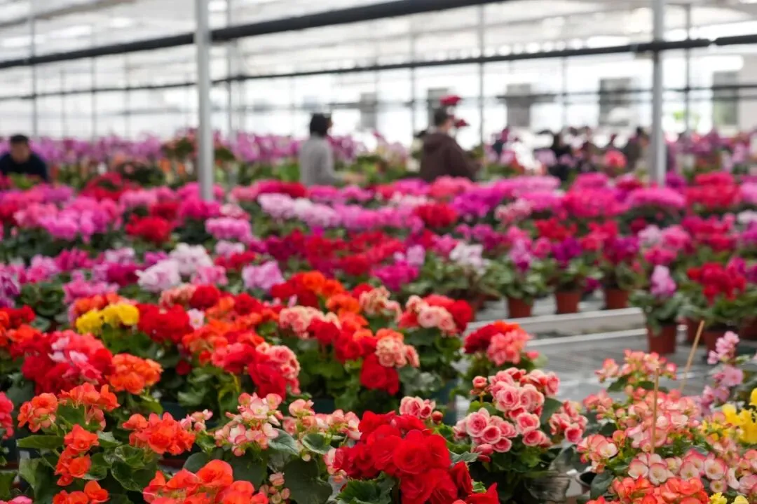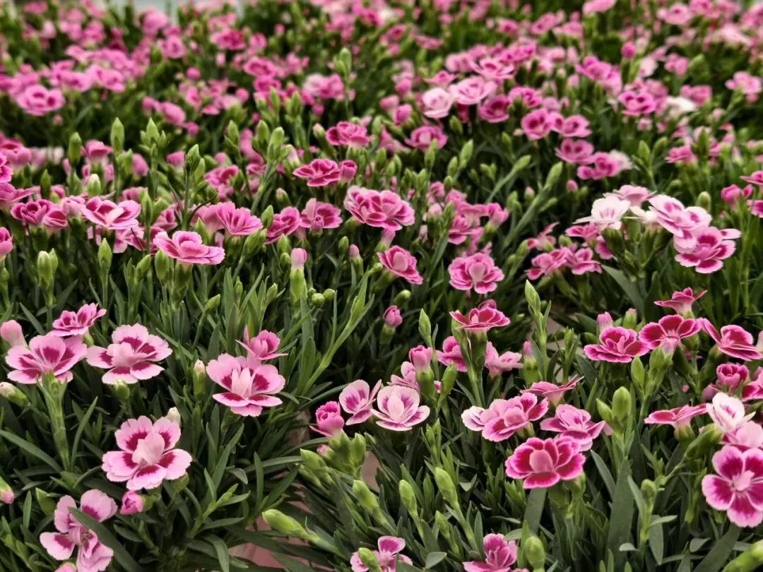 各类花卉被分区摆放,整齐而有层次。