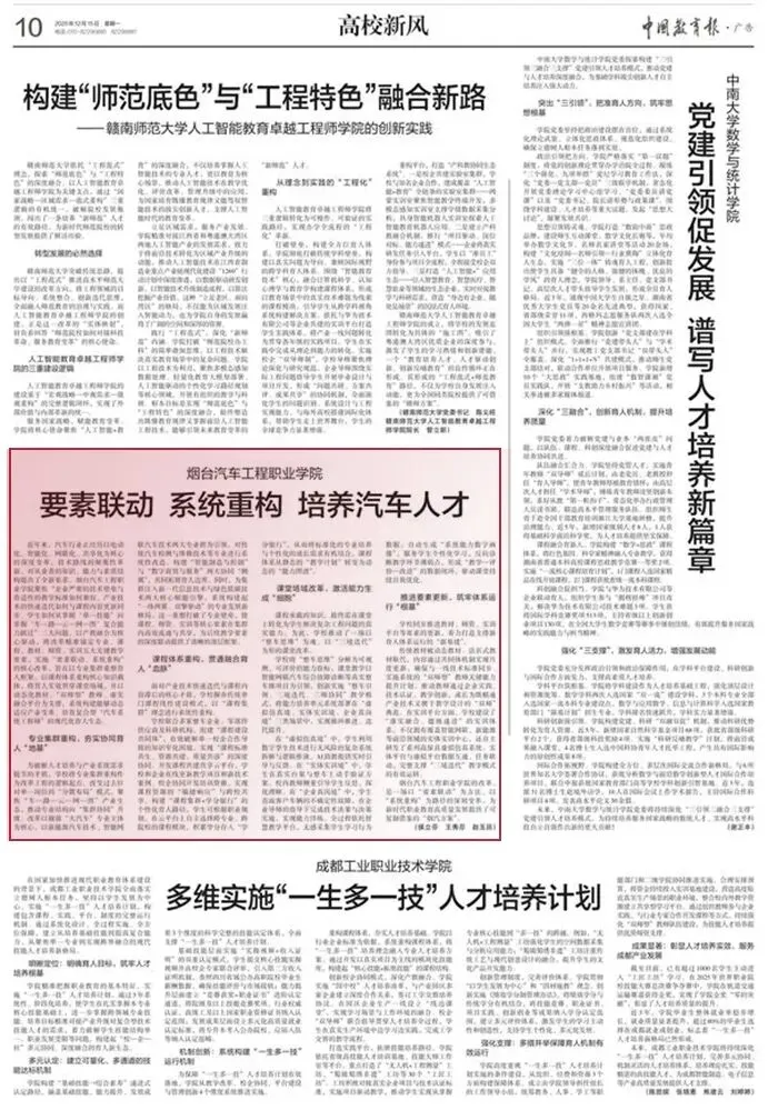 凭借在“要素联动、系统重构”育人模式创新方面的卓越成效,烟台汽车工程职业学院在《中国教育报》刊发了这篇成果案例。充分展现出学校的办学特色与高质量发展面貌。这不仅是学校深化教育教学改革的系统性成果,也为其他高校在应对产业变革、推动产教深度融合方面提供了宝贵的借鉴经验。