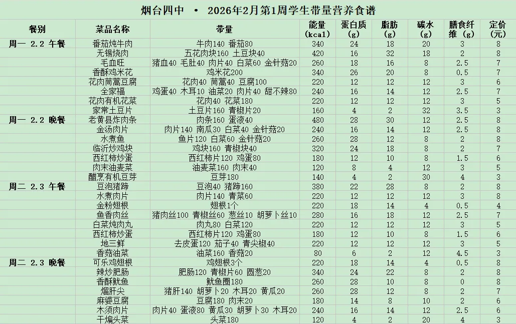 四中好“食”光,健康助成长——烟台四中2025-2026学年度第一学期第二十三周学生营养食谱