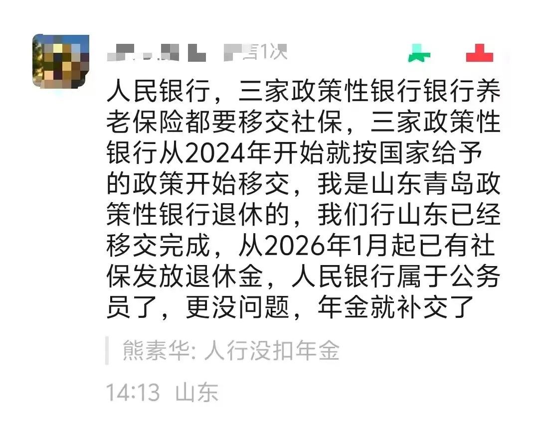 关于人民银行和政策性银行职工的社保问题,大米发现不少读者都非常关注。有的读者表示,人民银行的养老保险是内部统筹的,没有工伤保险、没有失业保险,医疗保险有的参加外面的,有的不参加外面的,公积金参加外面的。这应该是在2023年前,人民银行没有转为行政机关之前的做法吧,是否属实,有在人民银行工作的朋友也可以确认一下。目前社保大部分遵循的是“属地化”原则,即你在哪个地方工作,就在那里买社保,也在那里办退休。所以人民银行和政策性银行,目前的社保是怎么缴纳的呢?我们来看一看一位自称山东青岛政策性银行的读者留言,他是这样说的:人民银行,三家政策性银行银行养老保险都要移交社保,三家政策性银行从2024年开始就按国家给予的政策开始移交,我是山东青岛政策性银行退休的,我们行山东已经移交完成,从2026年1月起已有社保发放退休金,人民银行属于公务员了,更没问题,年金就补交了