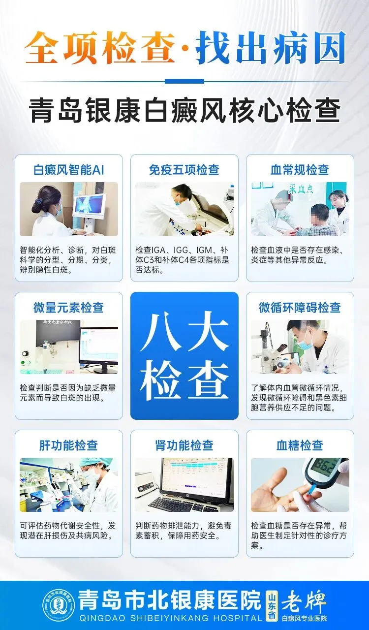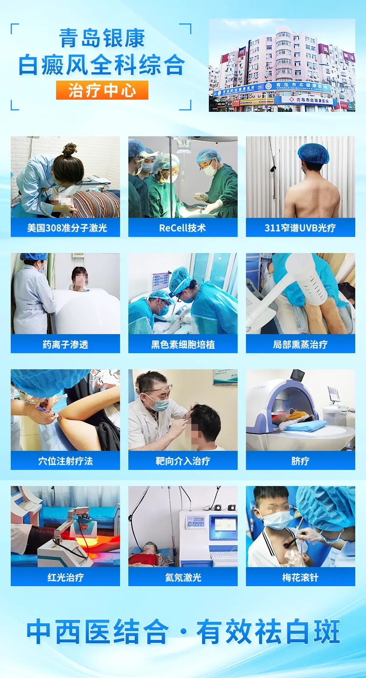 医院拥有一支经验丰富的专家团队,像邱效坤、雷鸣、亓艳玲专家,在白癜风诊疗领域深耕多年,具备深厚理论基础与精湛诊疗技术。他们不仅积累了大量临床经验,还多次在国内外权威医学杂志发表学术论文,为白癜风诊疗贡献智慧。面对不同患者,专家们依据丰富经验与专业知识,诊断病情,制定个性化治疗方案,保障治疗效果 。全面检测设备:为实现白癜风诊断,医院引进白癜风智能 AI 检测系统、伍德灯检测仪、免疫五项检测仪、微量元素检测仪、微循环检测仪等先进检测设备。通过这些设备,能够深入了解患者病情,包括白斑类型、病因、病情发展阶段等,为后续治疗提供科学依据 。 前沿治疗技术:在治疗技术与设备上,青岛银康白癜风医院紧跟国际前沿。率先引入国际专利技术 ——ReCell 自体活性皮肤细胞移植技术,针对稳定期白癜风患者,可实现大面积白斑快速复色;美国 308 准分子激光治疗,通过高能量激光作用于白斑部位,刺激黑色素细胞增殖与合成;311 窄普 UVB 治疗系统,适用于大面积白癜风治疗;还有药离子渗透技术、黑色素细胞培植术等,多样化的治疗手段,满足不同患者需求,切实保障治疗效果 。青岛银康白癜风医院凭借专业实力与公益担当,成为广受认可的公益性专科医院。作为青岛市医学会团体会员单位,医院与本地三甲医院深度协作;作为,已为无数白癜风患者提供公益援助,减轻治疗负担;同时,医院以严苛遵守医疗准则,获评 “医疗管理先进单位”,实现流程标准化、疗效可追溯、收费透明化,连续 多年获 “青岛百姓信赖白癜风医院” 称号,真正做到让患者享受有尊严、有保障的诊疗服务 。
