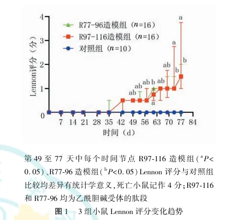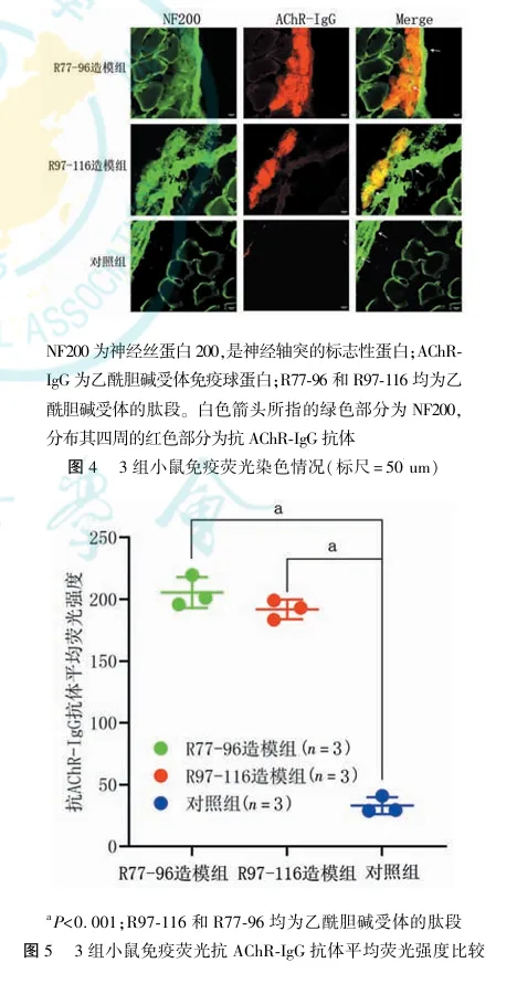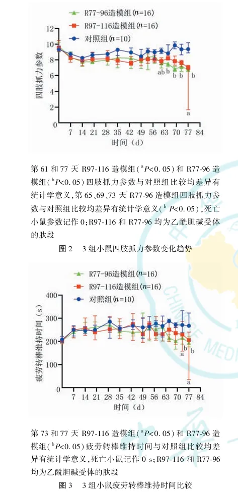 1.实验动物:雌性C57BL/6小鼠,6~8周龄,无 特定病原体(specific pathogen free,SPF)级,购自济 南朋悦实验动物繁育有限公司,饲养于隆科生物 (青岛)有限公司,合格证号:SCXK(鲁)2022-0006,实验室通风良好,相对湿度45%~65%,环境温度 (21±2)℃,12h昼夜更替,定期更换饲料、垫料和 水。 本实验严格遵循实验动物伦理保护规定执行, 并通过青岛大学附属医院医学伦理委员会批准,伦 审批件号:QYFYWZZLL293402. 主要试剂与仪器:R77-96(货号:24070049,杭 州肽佳生物科技有限公司);R97-116(货号: C633MJPKGO-1/ PE9985,金斯瑞生物科技公司);完 全弗氏佐剂(CFA)(货号:HY-153808,德国默克集 团);通用型组织固定液(货号:G1101-500ML,武汉 塞维尔生物科技有限公司);封闭用羊血清(工作 液)(货号:ZLI-9056,北京中杉金桥生物技术有限公 司);免疫染色通透液(TritonX-100)(货号:P0096 100mL,上海碧云天生物技术有限公司);NF-H/ NF200 抗体(18934-1-AP,武汉三鹰生物技术有限公 司);山羊抗小鼠 IgG(H+L)二抗 594(货号: 2445823,赛默飞世尔科技公司);山羊抗兔IgG(H+ L)二抗488(货号:2566328,赛默飞世尔科技公司); 小鼠抗AChR抗体ELISA试剂盒(货号:ml398745, 上海酶联生物科技有限公司)。 大小鼠抓力测定系 统(型号:ZS-ZL,众实科技);大小鼠转棒测试仪(型 号:ZS-RDM,众实科技)。1. 动物分组及 EAMG 模型建立:将 42只 C57BL/6 雌性小鼠按照体质量匹配原则分为3组: 对照组10只、R97-116 造模组16只、R77-96 造模组 16只。 R97-116 造模组和 R77-96 造模组分别以 R97-116 和 R77-96 肽段作为免疫原建立动物模型, 对照组仅注射无菌PBS。 将R97-116 和 R77-96 肽 段分别和无菌PBS配制成0.1mg/μL稀释液,用稀 释液与完全弗氏佐剂(按1 ∶ 1比例)制备抗原乳 剂。 初次注射小鼠时,取每只小鼠200μL抗原乳剂 或无菌PBS 于颈背部皮下注射,初次免疫后第14 天和第35天,再分别注射同剂量抗原乳剂或无菌 PBS1次。 为避免因挣扎而影响药物注射,对小鼠 采用吸入式异氟烷进行麻醉。 使用通用型小动物麻 醉机,以5%异氟烷与纯氧混合气体进行诱导,待小 鼠失去意识后,将其移至手术台,通过鼻锥维持麻 醉,异氟烷浓度调整为1.5%~2.5%以维持手术所 需深度,当小鼠出现以下情况时证明麻醉深度合适: ①翻正反射消失;②角膜反射存在但明显减弱;③ 呼吸频率平稳且规律;④对后肢趾间夹捏等伤害性 刺激无运动反应。2. 行为学评估时间、内容和评估标准:初次注射 后第1~49天,每隔7d 评估1 次,初次注射后第 50~77天,每隔3d 评估1 次。 评估内容:体质量、 Lennon 评分、四肢抓力、疲劳转棒实验(四肢抓力和 疲劳转棒实验间隔4h以上)。 评估均于当日完成。 评估标准依据盛誉妍等[16]所描述的:①Lennon 评 分≥1分;②四肢抓力参数较空白组下降;③疲劳转 棒维持时间较空白组减少;④血清AChR抗体含量较 空白组增加;⑤AChR抗体荧光染色阳性。满足①且、②、③、④、⑤中任意一项,则认为模型制备成功。3. Lennon 评分:对小鼠进行评分前先使小鼠 反复抓握笼顶20~30次(小鼠尾巴底部朝向笼子格 栅,当它的前肢抓住格栅时,慢慢地向后拉过格栅, 这样小鼠将进行一系列抵抗向后的抓握运动),以 模拟疲劳实验的效果。 观察小鼠表现,予以评分:0 分:无明确的肌无力表现;1分:撕咬无力,四肢力量 差,在光滑地面上前肢打滑,活动减少,且易疲劳;2 分:明显无力,在抓握前就出现震颤、低头、隆背、抓 力弱;3分:在抓握前即有严重的肌无力表现、无力抓握,濒死状态;4分:死亡。 动物症状在以上4者 之间可分别以0.5、1.5、2.5 计分。4. 四肢抓力参数:将小鼠平放于仪器网格栏上, 尾端正对操作者,待小鼠安静,抓持小鼠尾巴,沿水 平方向快速向后拉扯,使小鼠四肢抓握网格栏,直至 小鼠松抓,记录仪器显示最大值。 每只小鼠分别进 行8次四肢抓力测试,记录其后5次抓力大小,并取 其平均值,死亡小鼠参数记作0。 为排除体质量对 小鼠抓力的影响,每只小鼠称重3次,取平均值,精 确到小数点后1位数。 四肢抓力参数=四肢抓力 (g)÷体质量(g)。5. 疲劳转棒实验:每次评估均进行4次测试,第 1 次为适应性训练,记录后3次实验数据,每次间隔 30min,取3 次数据的平均值,死亡小鼠维持时间记 作0。 实验条件设置:初始速度4圈/min,加速时间 5s,持续时间60s;一级速度40 圈/min,加速时间 300s,持续时间10s;二级速度100 圈/min,加速时 间300s,持续时间1s。 每只小鼠放在不同通道上, 观察小鼠活动,除小鼠跌落转棒外,当出现以下情况 也按跌落处理:小鼠抱紧转棒随转棒一同旋转;小鼠 后肢累计两次以上蹬踩周围隔板。 记录小鼠疲劳转棒维持时间。6. 免疫荧光染色:初次注射78d后,每组随机 选3只小鼠,按0.5mg/10g腹腔注射1%戊巴比妥 钠麻醉小鼠,暴露心脏,使用0.9%NaCl溶液进行灌 注,再用4%多聚甲醛溶液进行灌注后取腓肠肌,脱 水、再固定,行冷冻切片(厚14 μm),未染色切片 20 ℃保存,染色后4 ℃保存。染色:切片经PBS浸 泡30 min,晾干20 min,用羊血清和0.3% Triton X-100封闭60 min,一抗(1 ∶ 400)4 ℃下孵育过夜, PBS洗涤3 次,一次15 min,应用合适的荧光二抗 (1 ∶ 400)常温下避光孵育60 min,PBS洗涤3 次, 一次15 min,抗荧光淬灭剂覆盖,封片。在Eclipse 50i荧光显微镜下观察荧光图像,用Image图像分析 系统进行处理。7.ELISA实验:第78 天取小鼠眶内静脉血 0.2 mL,4 ℃、3 000×g离心15 min后取上层血清。 根据ELISA试剂盒说明书进行操作,在酶标仪波长 450 nm处测定OD值,根据标准曲线,计算抗体浓 度,死亡小鼠不计入统计。8.统计学