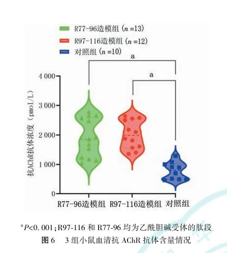 Lennon评分结果显示,3 组小鼠Lennon评分的 时间和组别交互效应显著(χ2 交互 =665. 108,P< 0.001),时间主效应和组别主效应均显著(χ2 时间 = 265.055, χ2 组别 =82.957,均P<0.001)。初次注射后 第35 天 R77-96造模组出现肌无力症状小鼠,第43 天 R97-116造模组出现肌无力症状小鼠,两组均随 时间进行性加重。至第77 天,R77-96造模组 Lennon评分为1.50(1.00,2.00)分,其中13 只评分 达到1 分以上,3 只死亡;R97-116造模组为1.50 (1.00,3.75)分,其中12 只评分达到1 分以上,4 只 死亡;对照组为0(0,0)分。R77-96和R97-116造模 组评分均高于对照组(均P<0.001),R77-96造模组 与R97-116造模组比较差异无统计学意义(P= 1.000)。R77-96造模组小鼠死亡率为18. 75%, R97-116造模组死亡率为25.00%,两者比较差异无统计学意义(Fisher精确检验显示双侧P=0.529)。 见图1。四肢抓力参数结果显示,3 组小鼠四肢抓力参 数的时间和组别交互效应显著(χ2 交互 =1 199.047,P< 0.001),时间主效应和组别主效应均显著(χ2 时间 = 327.918,χ2 组别 =69.900,均P<0.001)。前21 d 3组 四肢抓力参数发展趋势相似,第28 天 R77-96和 R97-116造模组参数随时间逐渐下降,而对照组指 数随时间逐渐上升。至第77 天,R77-96造模组四 肢抓力参数为7.11(6.59,7.48),R97-116造模组 参数为7. 05(1. 63,7. 68),对照组9. 37(8. 90, 10.19)。R77-96和R97-116造模组四肢抓力参数 均低于对照组(均P<0. 001),R77-96造模组和 R97-116造模组四肢抓力参数比较差异无统计学意义 (P=1.000)。见图2。 三、3 组小鼠疲劳转棒维持时间比较 疲劳转棒实验结果显示,3 组小鼠疲劳转棒维 持时间的时间和组别交互效应显著(χ2 交互 = 2 250.427,P<0.001),时间主效应和组别主效应均 显著(χ2 时间 =219. 566,χ2 组别 =9. 209,P时间 <0. 001, P组别 <0.05)。3 组小鼠维持时间在前42 d随时间 变化趋势基本相似,第49 天,R77-96和R97-116造 模组维持时间均开始随时间进行性下降。至第77 天,R77-96造模组维持时间为194. 08(177. 33, 222.56)s,R97-116造模组时间为205.84(35.23, 240. 26) s,对照组时间为267. 47(261. 62, 322.69)s,R77-96和R97-116造模组时间均低于对照 组(均P<0.001),R77-96造模组与R97-116造模组时间比较差异无统计学意义(P=1.000)。见图3。荧光染色结果显示,3 组小鼠腓肠肌抗AChR IgG抗体平均荧光强度差异有统计学意义(F= 314.242,P<0.001),R77-96造模组抗AChR-IgG抗 体平均荧光强度为205.52±12.43,R97-116造模组 为191.85±7.88,对照组为33.07±6.82。R77-96造 模组和R97-116造模组抗AChR-IgG抗体平均荧光 强度均高于对照组(均P<0.001),R77-96造模组与 R97-116造模组比较差异无统计学意义(P= 0.124)。R77-96造模组和R97-116造模组轴突(神 经丝蛋白)附近存在IgG抗体沉积,对照组该区域无IgG抗体沉积。表明R77-96造模组和R97-116造 模组小鼠体内均产生自身致病性抗体并沉积于轴突 附近,符合EAMG模型的病理表现。见图4、图5。 ELISA结果显示,3 组小鼠血清抗AChR抗体 含量差异有统计学意义(F=18.821,P<0.001)。 R77-96造模组血清抗AChR抗体含量为 (1 898.08±655.44) pmol/L,R97-116造模组AChR 抗体含量为(2 013.97±476.58) pmol/L,对照组 AChR抗体含量为(780. 74±292. 88) pmol/L。 R77-96造模组和R97-116造模组抗AChR抗体含量 均高于对照组(均P<0. 001),R77-96造模组与 R97-116造模组比较抗体含量比较差异无统计学意 义(P=0.577)。见图6。