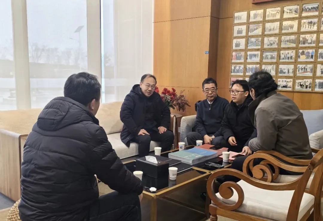 山东工艺美术学院董占军院长与画家苏国强、宝龙美术博物馆馆长刘建栋在会议室交流画展事宜