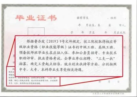 ◆ 根据鲁办发【2019】9号文件规定,技工院校取得相应等级职业资格(职业技能等级)证书的中级工班、高级工班、预备技师班毕业生在应征入伍、参加公务员招考、专业技术职称评审、职业资格考试、企事业单位招聘、“三支一扶”招募、确定工资起点标准、就业创业扶持等方面,分别按照中专、大专、本科毕业生享受相关待遇。