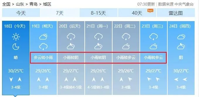 【青岛市区】今天白天,晴间多云,北风转南风3到4级,今天夜间,晴间多云,有轻雾,南风3到4级,今天最高气温30℃,最低气温25℃,相对湿度50%-90%。19日白天到夜间:晴转阴有阵雨或雷雨,南风3到4级阵风6级,雷雨时阵风7到9级,26到29℃。20日白天到夜间:阴有阵雨或雷雨,南风3到4级转4到5级阵风6级,雷雨时阵风7到9级,27到29℃。【预报各区】今天白天到夜间,晴间多云,东部和北部短时阴有分散性阵雨或雷雨,有轻雾,北风转南风,海上5到6级,雷雨时阵风8级,内陆3到4级,雷雨时阵风8级。19日白天到夜间:晴转阴有阵雨或雷雨,南风3到4级阵风6级,雷雨时阵风7到9级。20日白天到夜间:阴有阵雨或雷雨,南风3到4级转4到5级阵风6级,雷雨时阵风7到9级。来源:青岛气象、山东天气、中国天气网