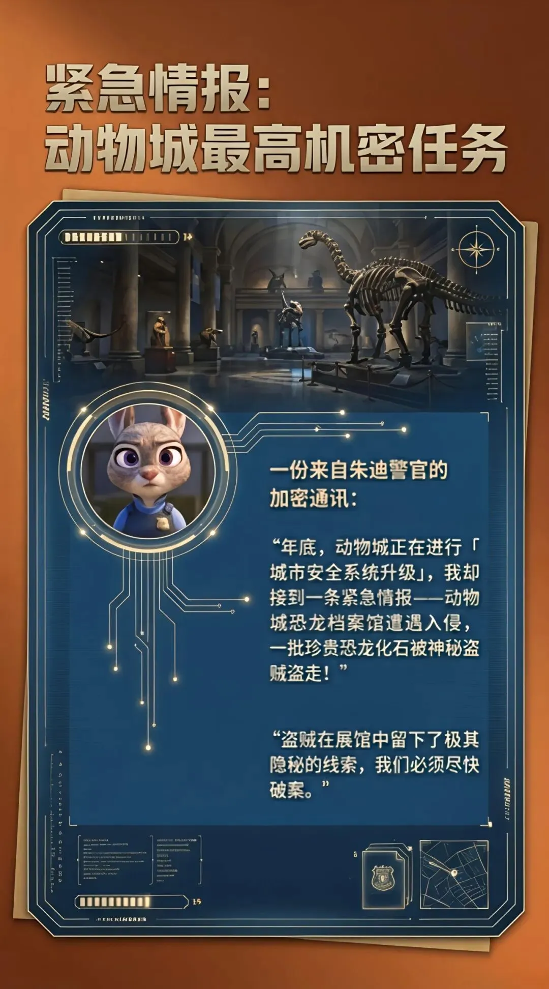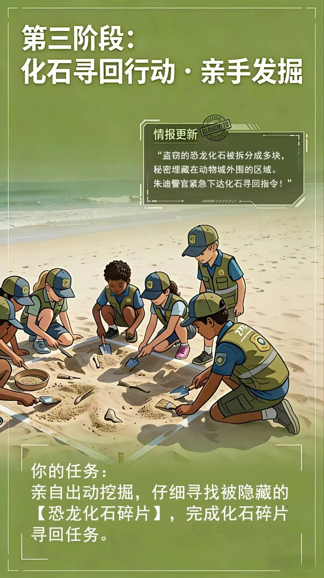 动物城情报确认:失窃的恐龙化石被拆分成多块,并被秘密埋藏在动物城外围的区域。朱迪警官紧急下达化石寻回指令——少年调查员需亲自出动挖掘,