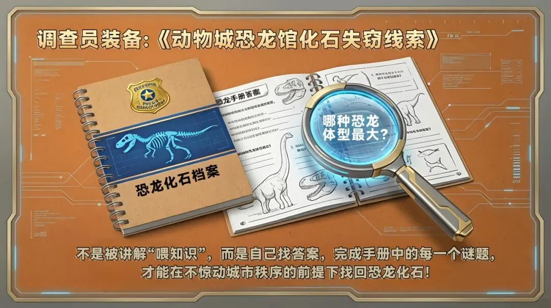 ✅ 拿着研学手册,自主探馆✅ 观察恐龙化石与模型细节✅ 破解盗贼留下的隐秘密码✅ 在展厅中完成一场完整破案