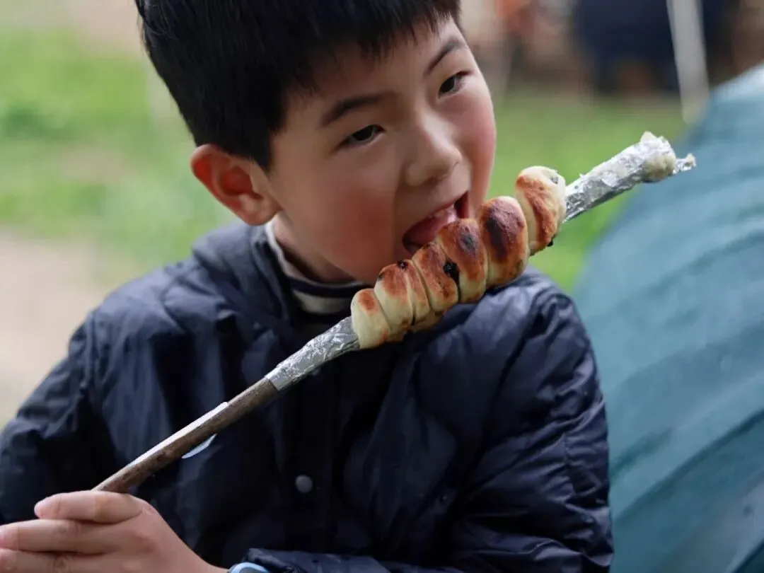 孩子们到达补给站后领取:树棍+小份面团