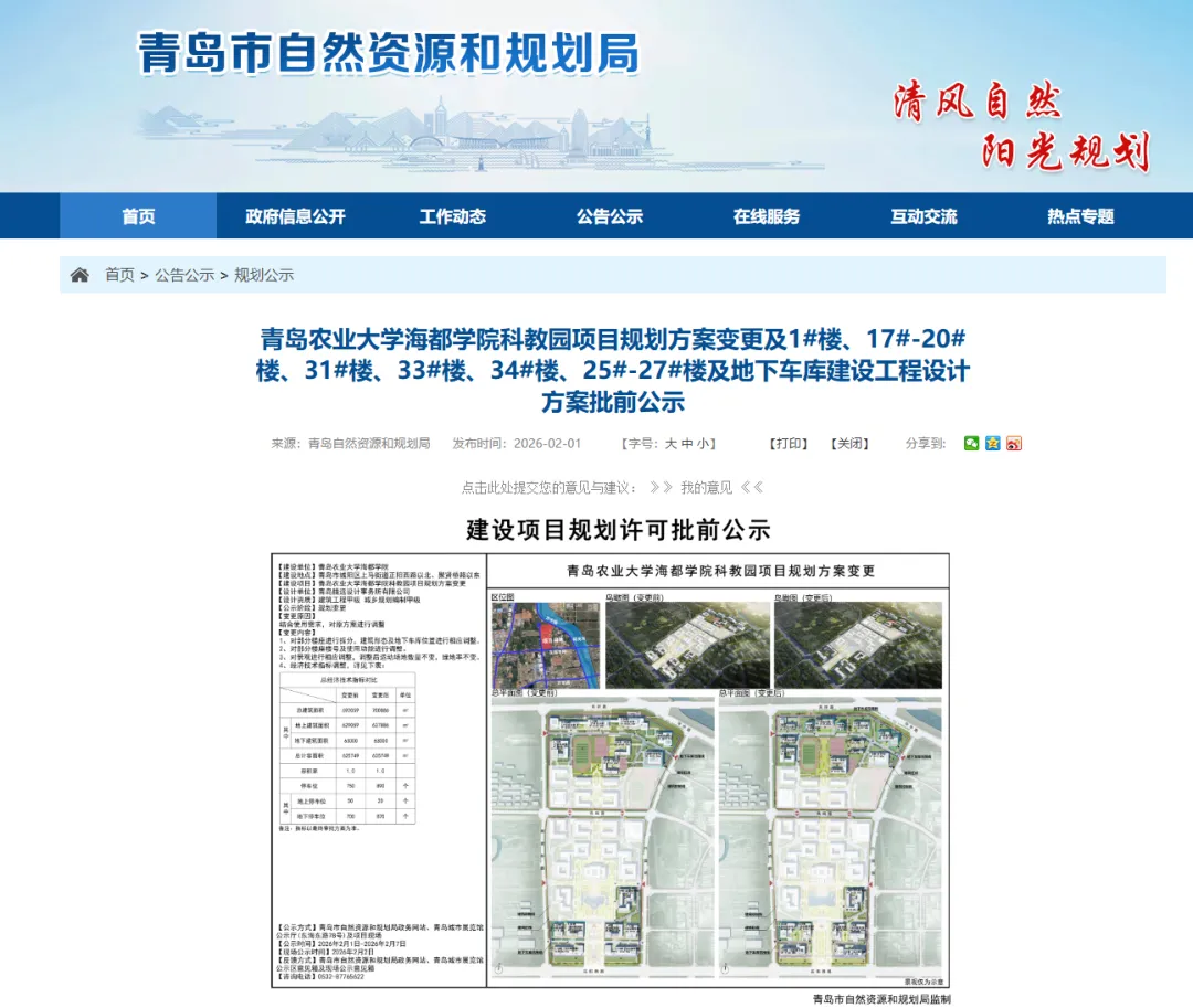 2月1日,青岛市自然资源和规划局发布《青岛农业大学海都学院科教园项目规划方案变更及1#楼、17#-20#楼、31#楼、33#楼、34#楼、25#-27#楼及地下车库建设工程设计方案批前公示》。
