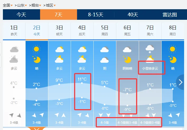 7—8日,烟台北部和威海天气多云间阴有小雪,其他地区天气晴转多云。北风,鲁西北、鲁中和半岛地区4~5级阵风6级减弱到3~4级,其他地区3~4级。