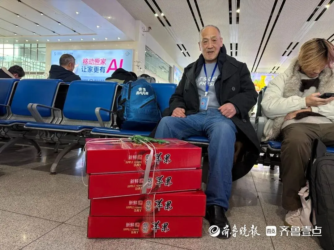 “烟台苹果寓意平平安安,回去分给亲戚朋友,让大家都尝尝烟台的味道,也送上我的新年祝福。”准备回湖北老家的王先生,手里提着满满当当的苹果礼盒,脸上满是归乡的喜悦。