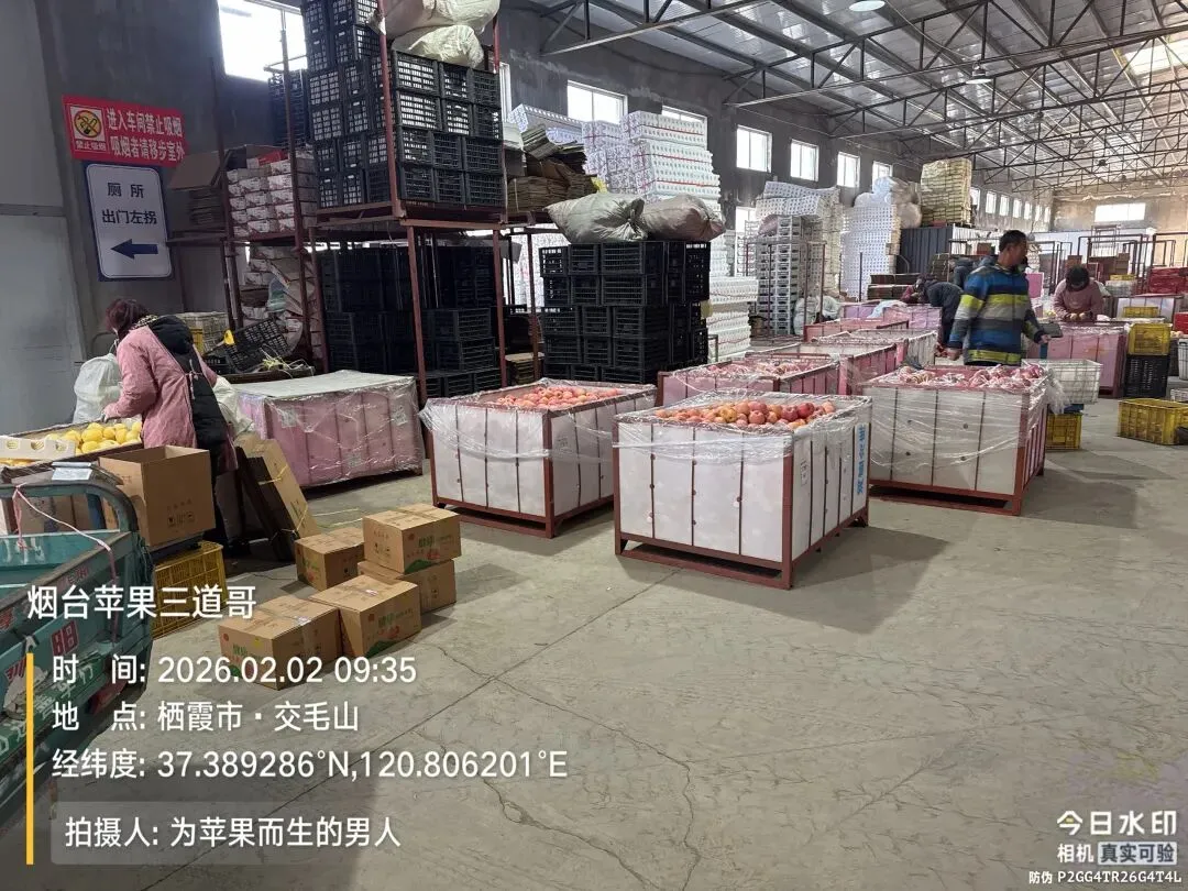 今天是2026年2月2日,腊月十五,这几天随着产地发货量的进行中,市场上礼盒的到货量开始逐步增多,有些市场上的礼盒已经开始堆积。有客商反馈今年市场上礼盒的销售情况并不太乐观,有客商反馈市场上的货满满的,市场上看货的商贩空空荡荡的,一些有销售能力的商超都是自己在产地备货的。这几天产地冷库礼盒包装的客商开始逐步停手,一些小单车跟周边的客商也开始撤离,剩下的多是一些自己没有销路的存货商,在包装找寻市场,今年苹果的价格跟质量让很多客商接受不了。从目前的情况来看,年后东西部价格战的可能性很大。