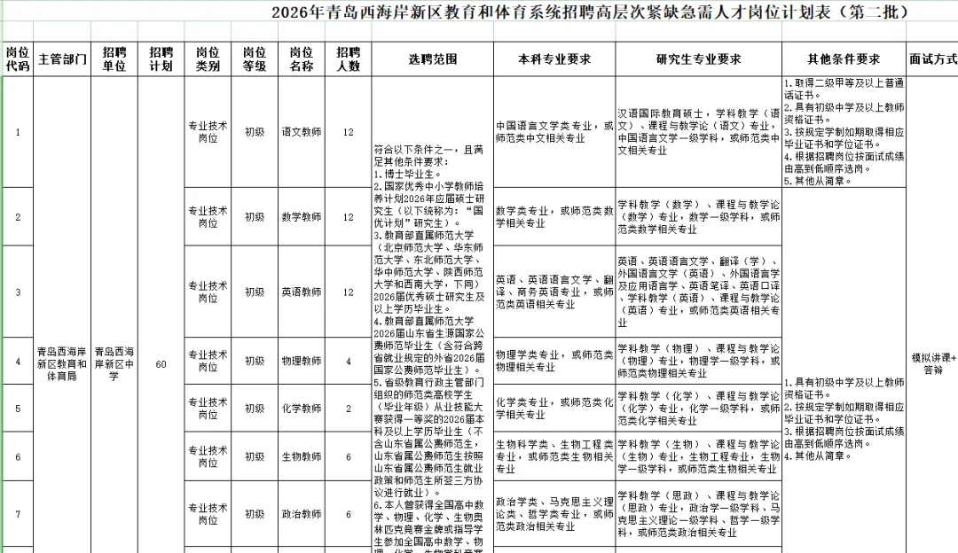 ▲点击下载附件1:青岛西海岸新区教体局60人计划表