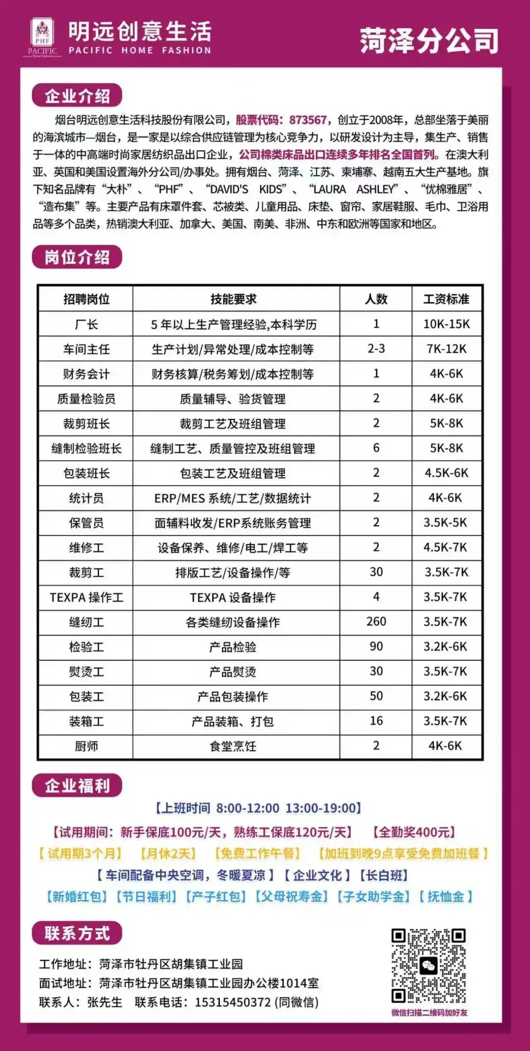 为适应公司战略发展需要,现于胡集镇工业园区设立分公司,诚邀各界英才加入,共同打造国际一流的家居纺织品生产基地。