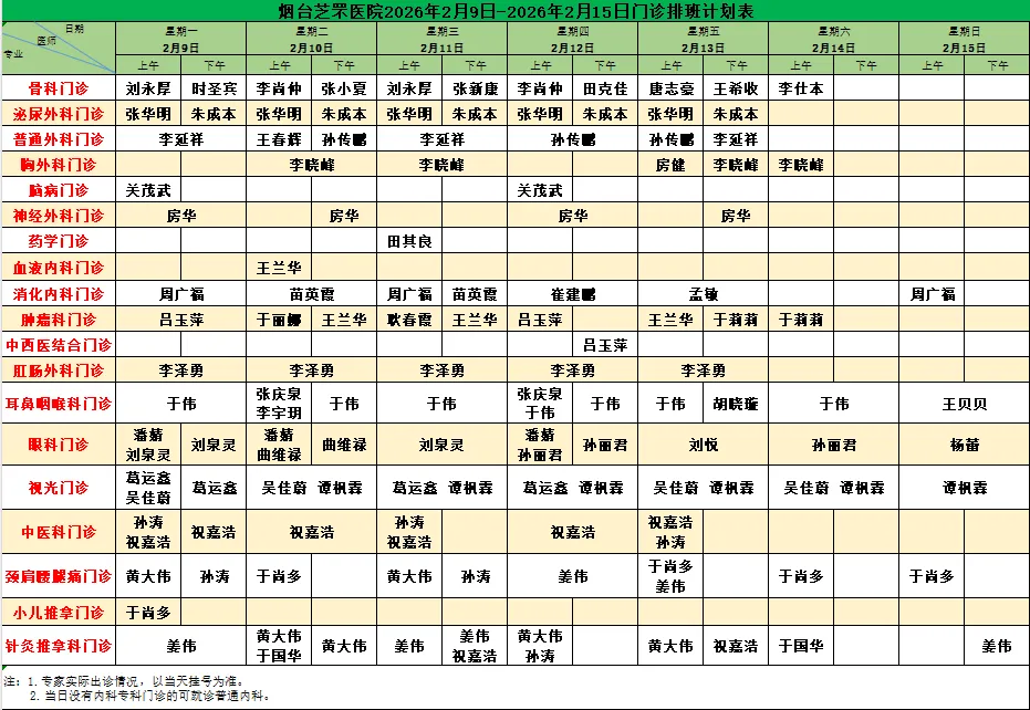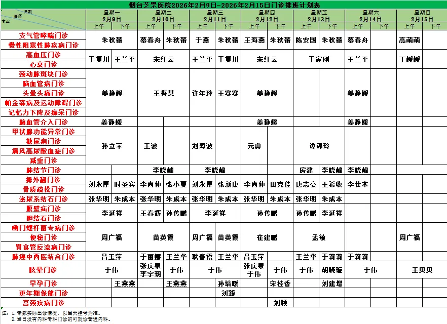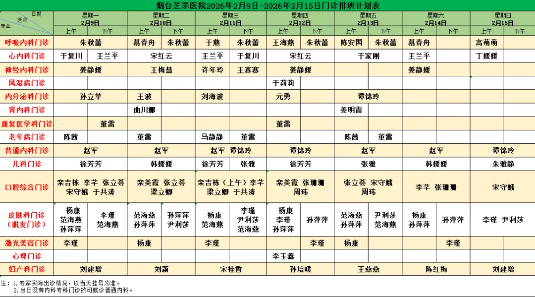 烟台芝罘医院(含毓璜顶专家)门诊排班计划表(2026年2月9日-2月15日)