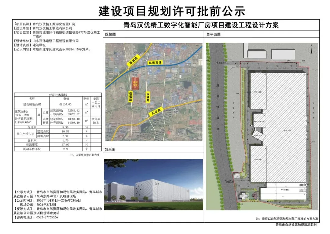 青岛汉优精工数字化智能厂房项目建设工程设计方案批前公示