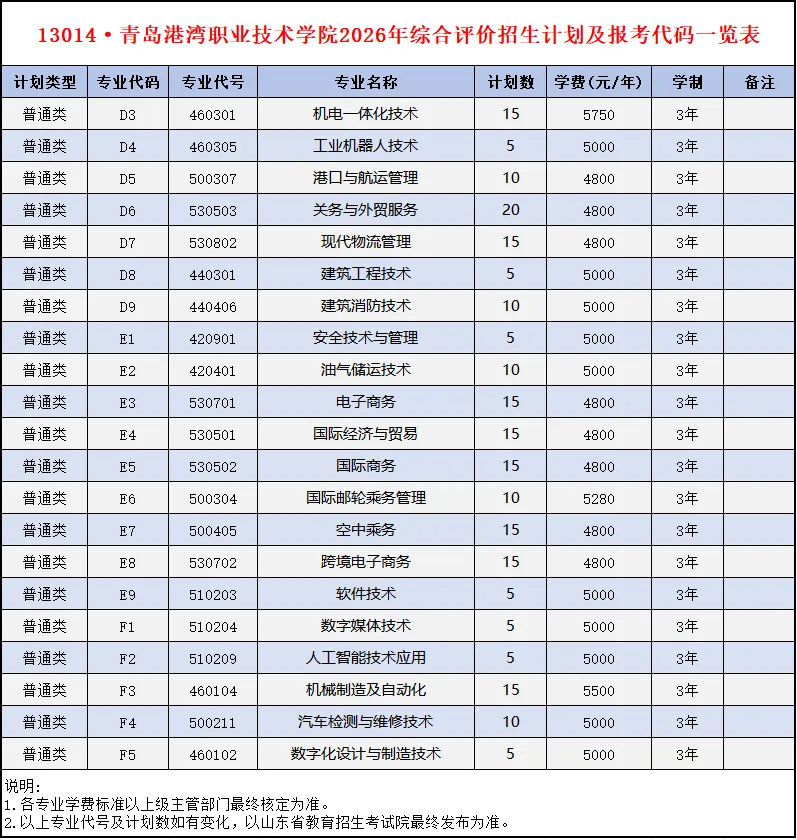 >青岛港湾职业技术学院2026年单招综评招生计划