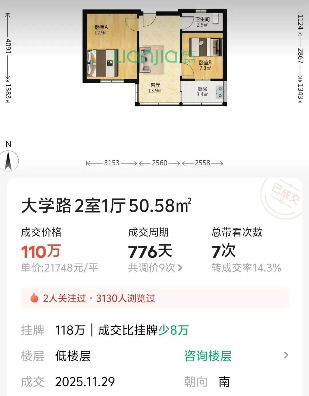 但这一格局,已经被打破。随着全城教师轮岗深化,市南“老牌名校”师资优势被稀释,“教育护城河”渐浅。从二手房成交可见降温态势,根据链家数据统计,近三年大学路片区二手房成交均价从3.22万/㎡跌到了1.71万/㎡,跌幅46.8%。据中介透露,市南片区老破小学区房降价趋势明显、成交周期拉长。以最近一套大学路50.58㎡套二学区房为例,从2023年挂牌价238万,历时776天,调价9次,最终以110万成交,单价21748元/㎡,而同片区房源在2020年成交价高达8-9万元/㎡。